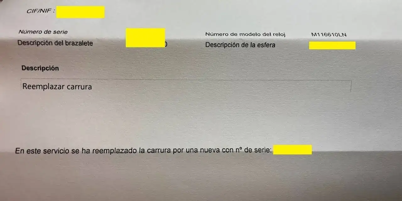 En estos momentos creo que hubo un momento de empatía y cordura, ya hablamos mas tranquilamente y ya los dos con un tono mas cordial se ofreció hacerme un cambio de caja o carrura del reloj para subsanarlo. Dicho cambio se hizo en apenas unos días y luego quedó reflejado en un documento como se ve a continuación: