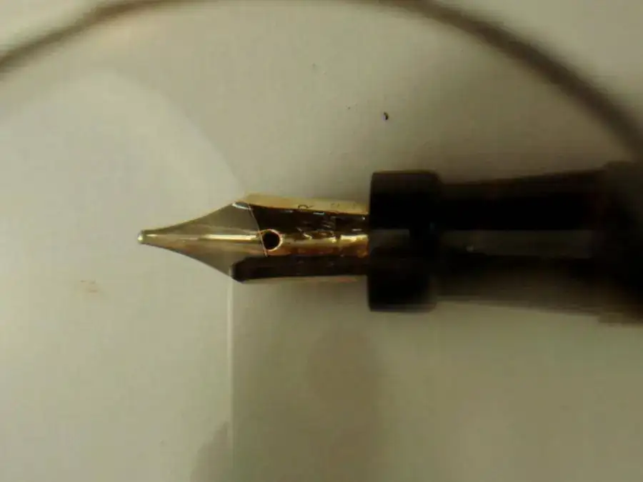 Éste es el plumín, que conservó su flexibilidad original. Cuesta ver la soldadura, excepto porque la inscrición se interrumpe:
