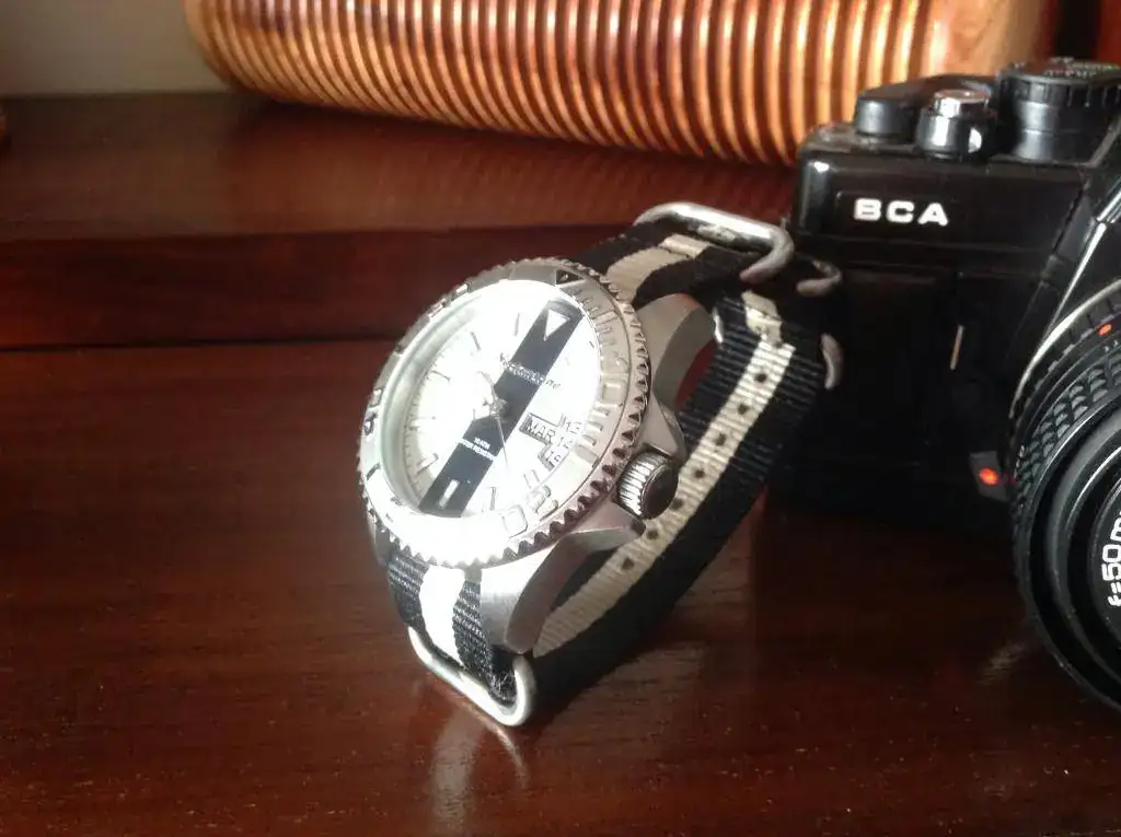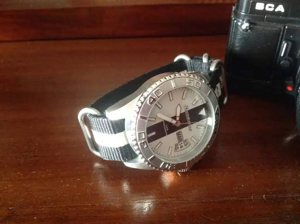saco para venta este reloj por falta de uso,tiene pequeñas marcas de uso en general y la correa zulú nato está a medio uso también.