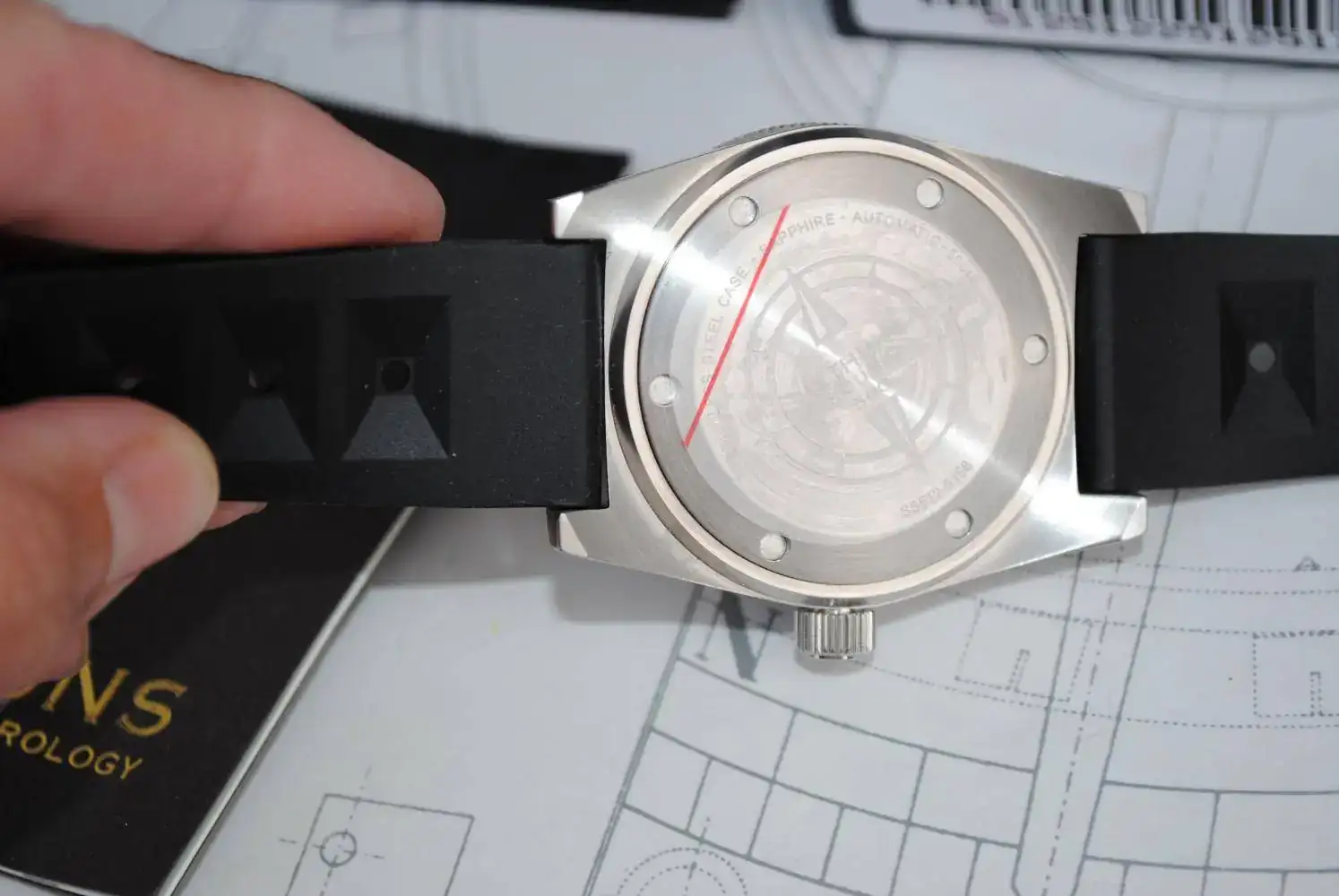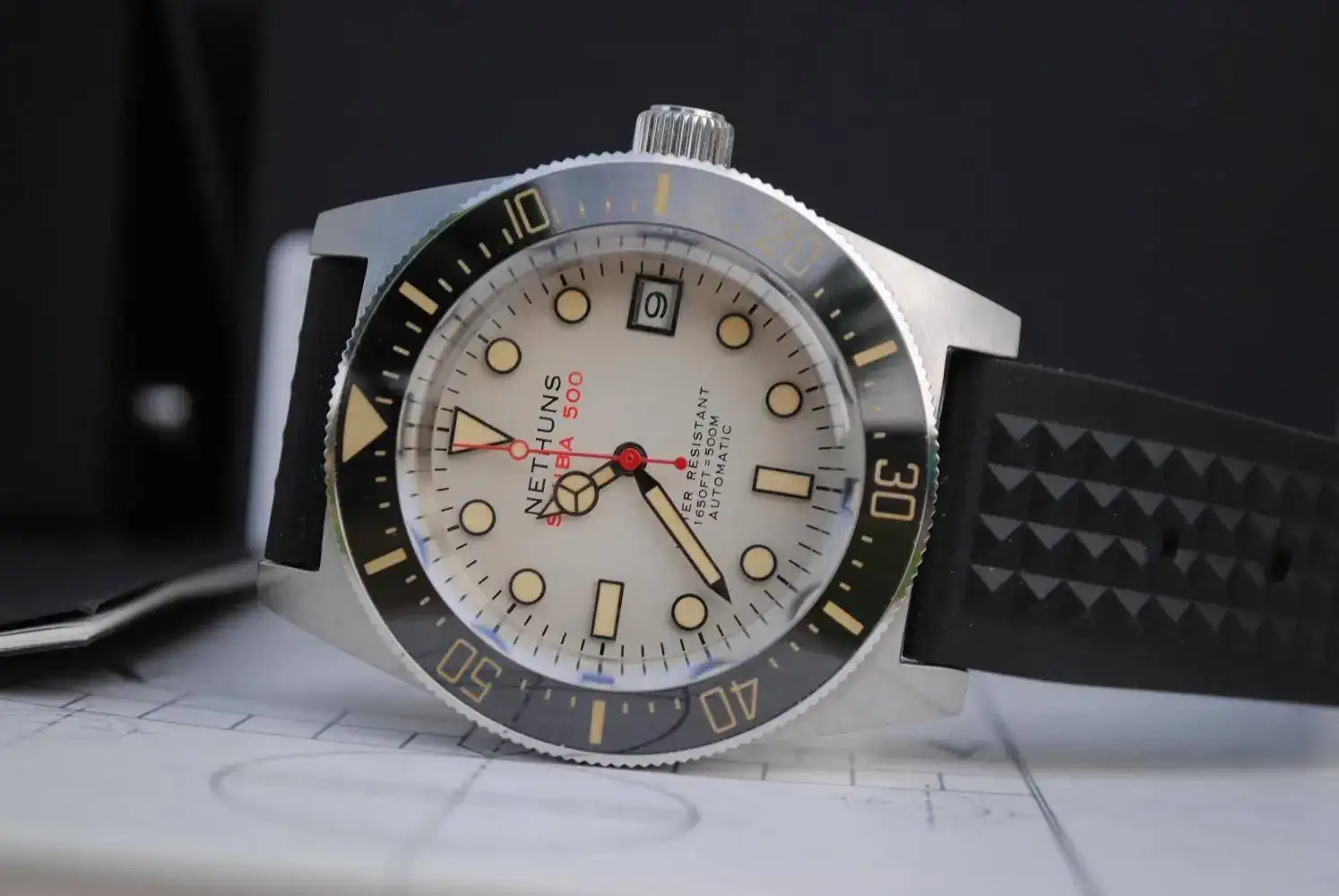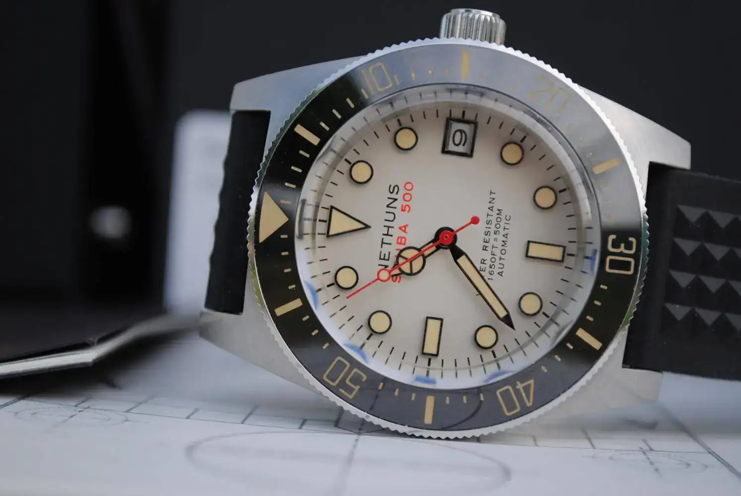 Cristal de zafiro abombado, calibre automático Seiko NH-35 ,bisel cerámico con lumen en los números. Es un espectáculo ver este reloj en la oscuridad. La correa es la original de caucho , con el bucle firmado.