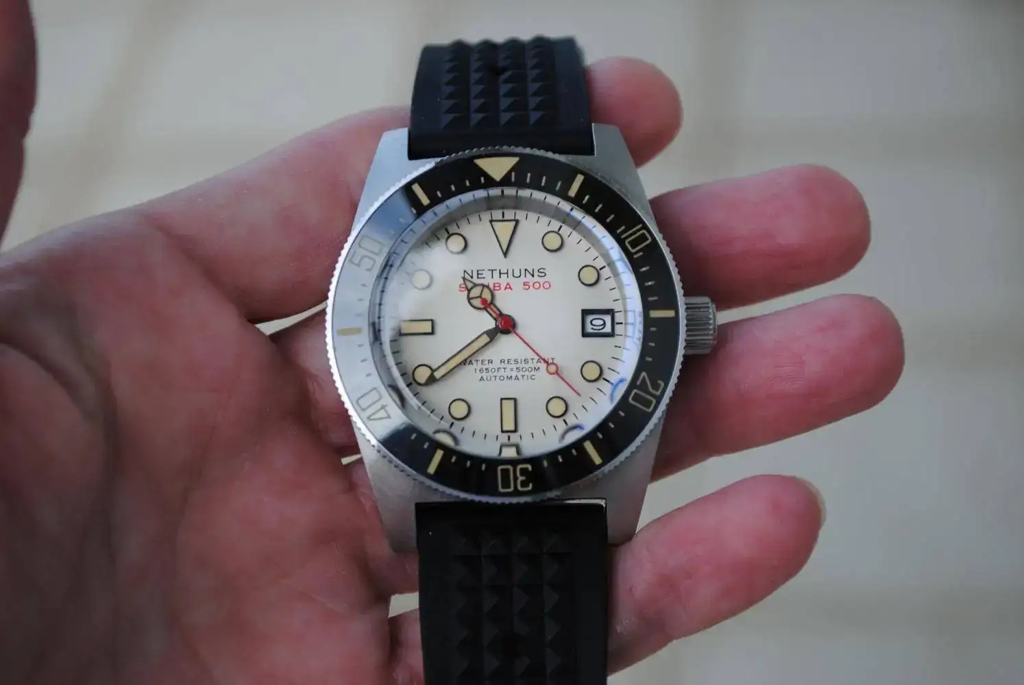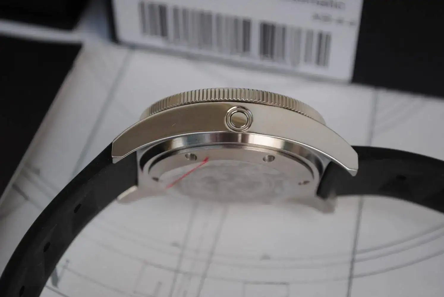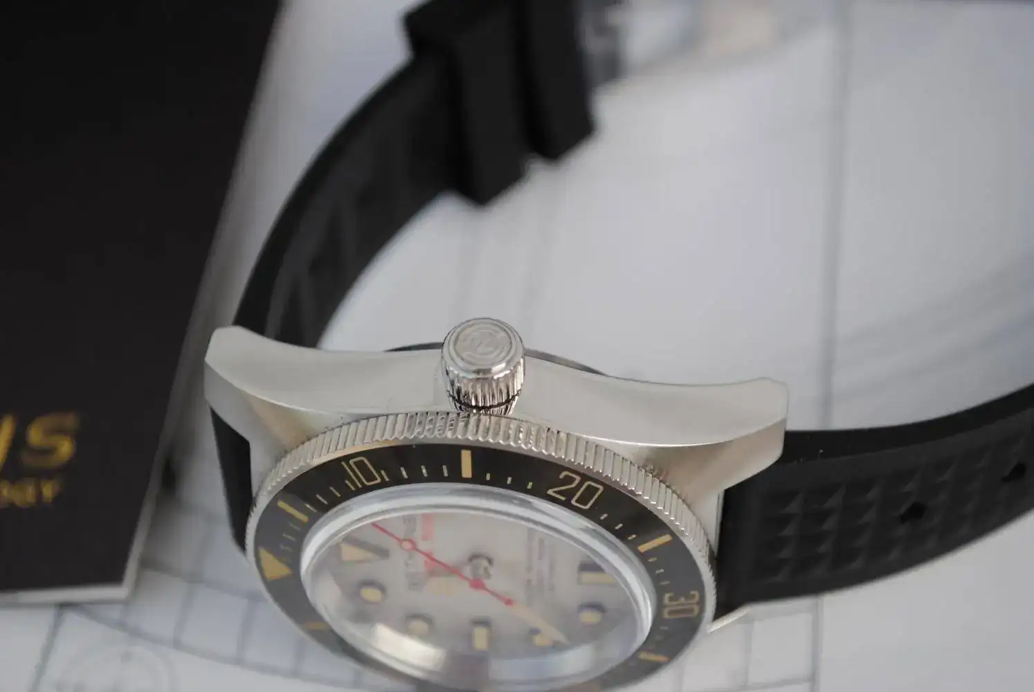 Cristal de zafiro abombado, calibre automático Seiko NH-35 ,bisel cerámico con lumen en los números. Es un espectáculo ver este reloj en la oscuridad. La correa es la original de caucho , con el bucle firmado.