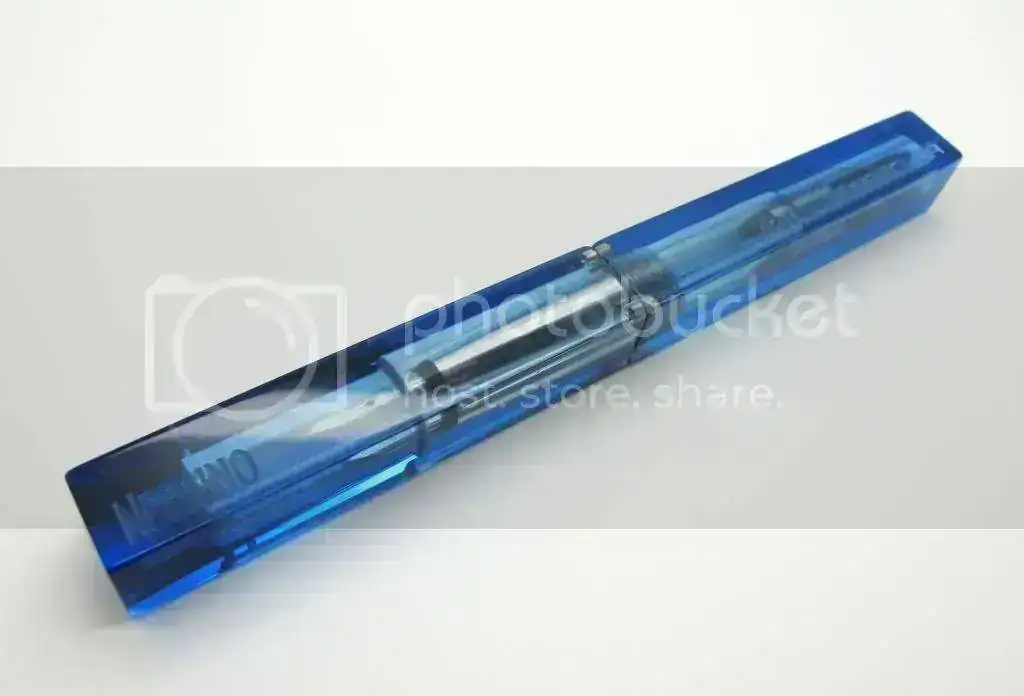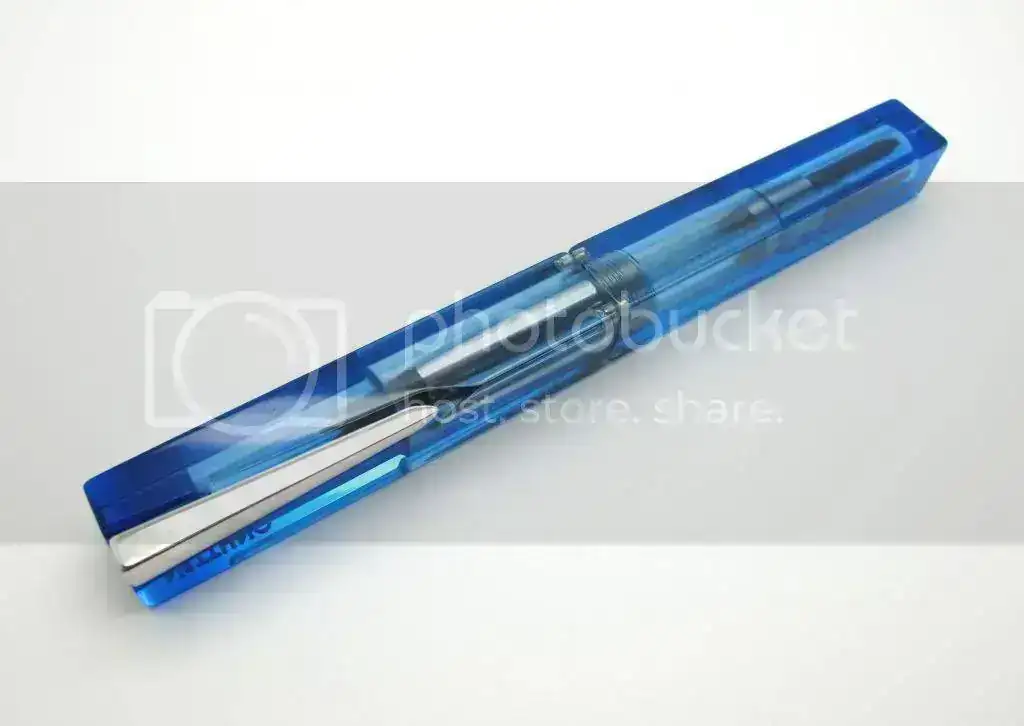 Después de esta cronología de la marca Nettuno presento la pluma estilográfica que nos ocupa, La Nettuno Barracuda, no es la más representativa de la marca pero sí un alarde de diseño que no deja indiferente. Esta pluma estilográfica se fabricó en el año 2005 en varios colores de resina translúcida y poseé un sistema patentado de cierre por medio de imanes. El clip está perfectamente integrado en la cuadratura de la pluma por lo que no sobresale del plano.