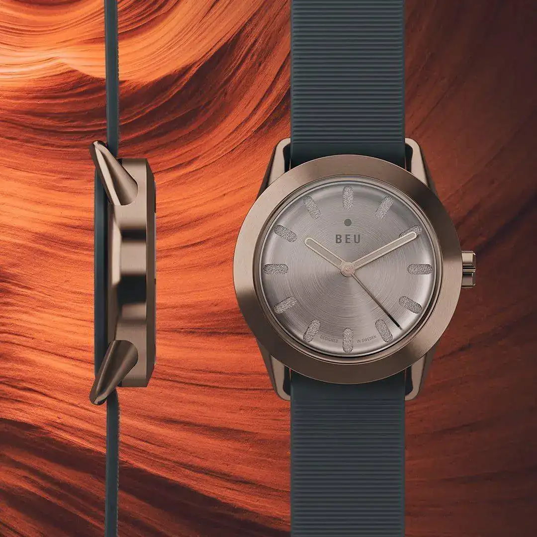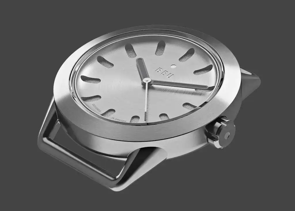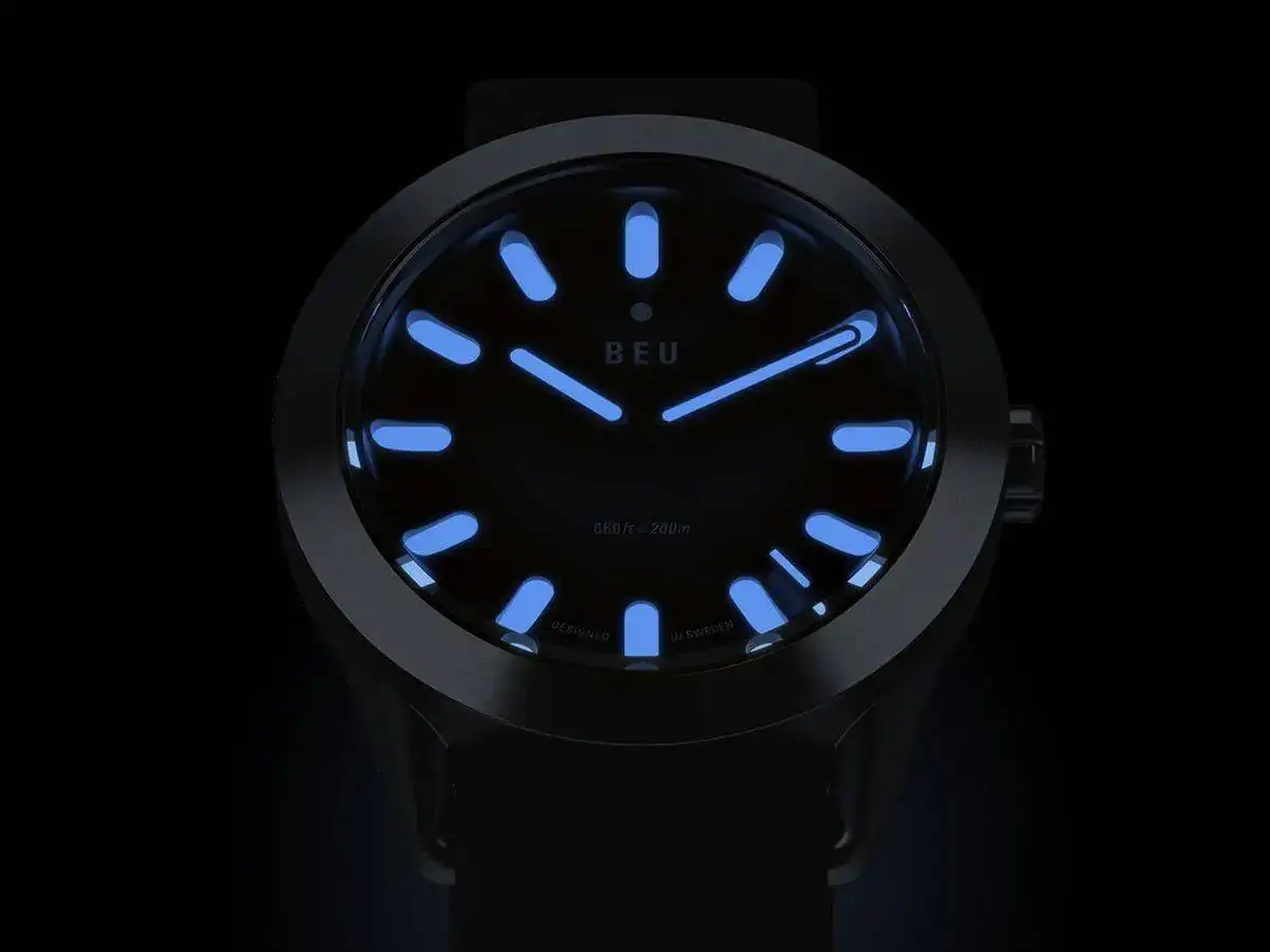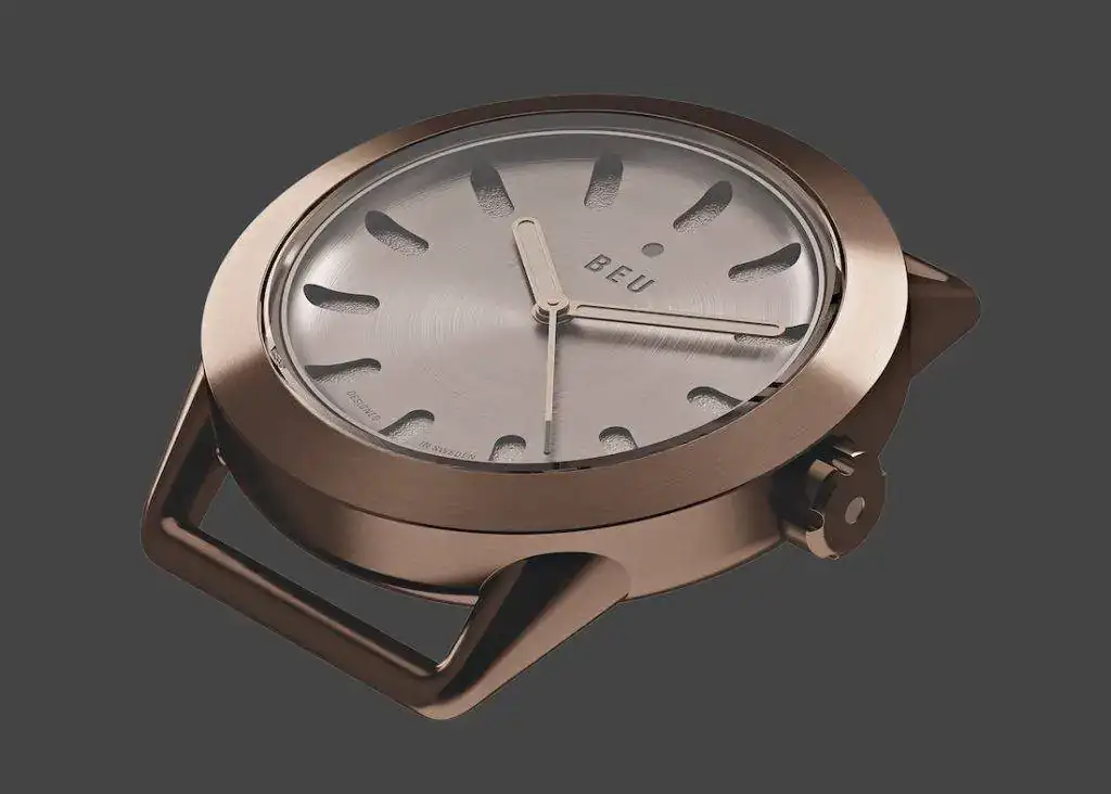 BEU ha construido un caso en el que diferentes características de una sola materia prima interactúan y convergen para presentar una digna celebración del tiempo. La esfera interior está hecha de dos capas de metal. La curva de la primera capa fresada añade una personalidad única a la forma Solid, mientras que las aberturas perforadas permiten que la luz juegue contra el fondo arenado. Las agujas discretas, junto con la marca de excelencia BEU grabada, conforman la cara de la esfera. Las asas asimétricas construyen carácter. Y el cristal de zafiro antirreflectante de doble capa proporciona la máxima protección”