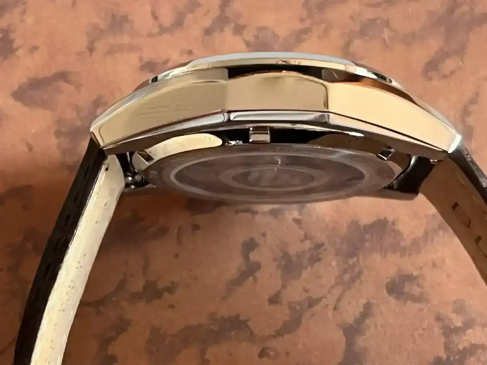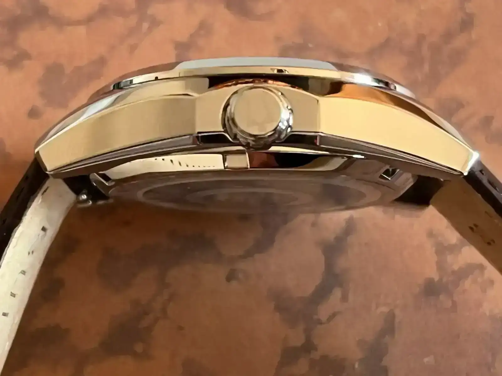 La caja. La caja se sale de los standards de forma tipo Oyster. Eso para mí fue arrebatador. Esos lados biselados le dan personalidad al reloj. Toda la caja es pulida y en las zonas biseladas consiguen un contraste de brillos sublime.La corona firmada es a presión. Las asas son generosamente anchas, pero no hacen que la distancia entre ellas de 20 mm parezca pequeña
