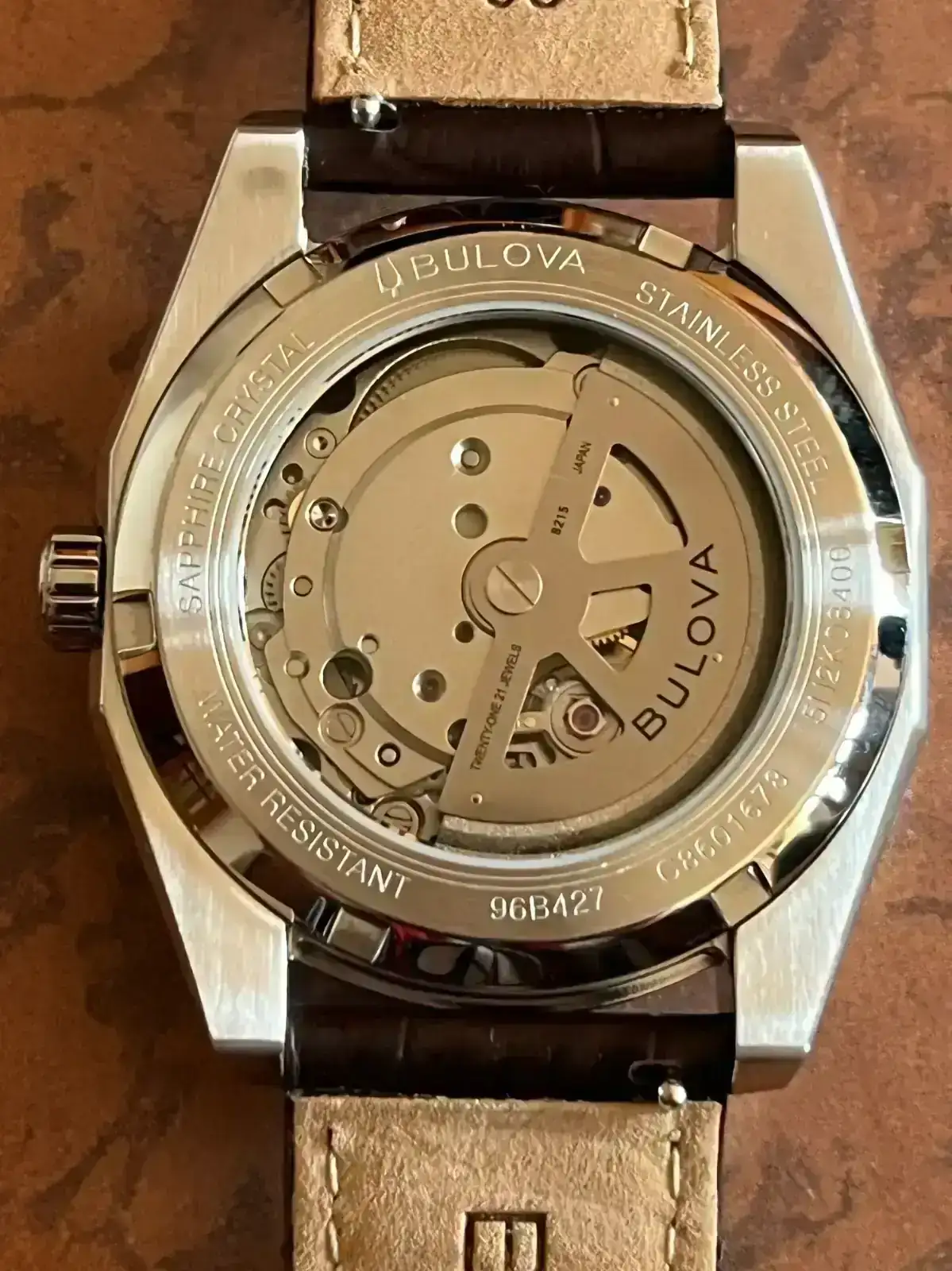 La trasera y el mecanismo. En la trasera es donde se ve realmente la forma de la caja. Allí vienen grabadas todas las especificaciones del reloj, incluyendo que lleva cristal de zafiro, y un cristal que deja ver el mecanismo que tiene parada de segundero y rotor personalizado. Aun siendo un Miyota serie 8000 , se ve que está personalizado por la marca y tiene una acabado que con la lupa de relojero se ve muy superior a lo que yo estaba acostumbrado en esta gama de mecanismos. Vale, no es a 28.800 alternancias, pero suficiente para un movimiento de la aguja del segundero muy fluido e hipnótico. Además dejan bien claro que el movimiento es Japan Made.