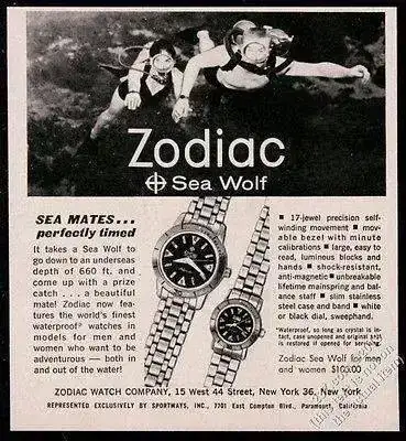 El Sea Wolf de Zodiac fue el primer reloj de buceo (propiamente dicho) allá por 1953. Misma fecha en la que también vieron la luz el Blancpain Fifty Fathoms y poco después el Rolex Submariner. Si no recuerdo mal, era el Sea Wolf el que más profundidad asegurada garantizaba; Fifty Fathoms 300 feet. Sea Wolf`s 10 ATM, esto es; 339 feet. Algo así...