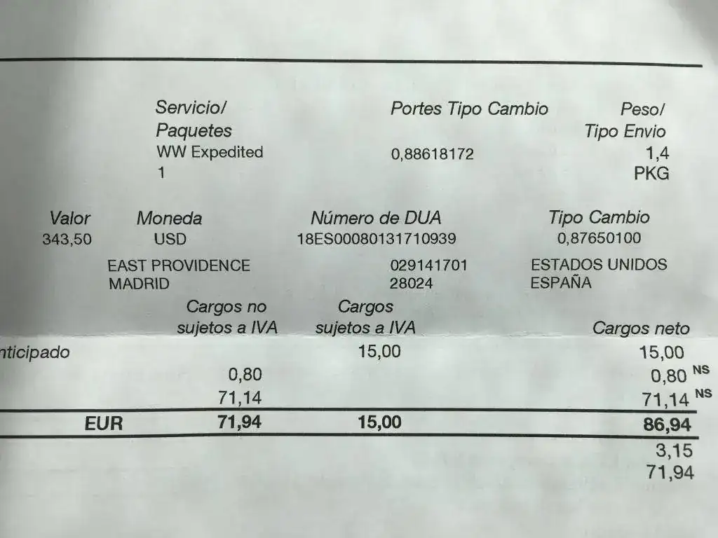 Adjunto un certificado de pago de otro reloj que costó 343$ y pagué 90€ de aduanas, aranceles y gastos de gestión: