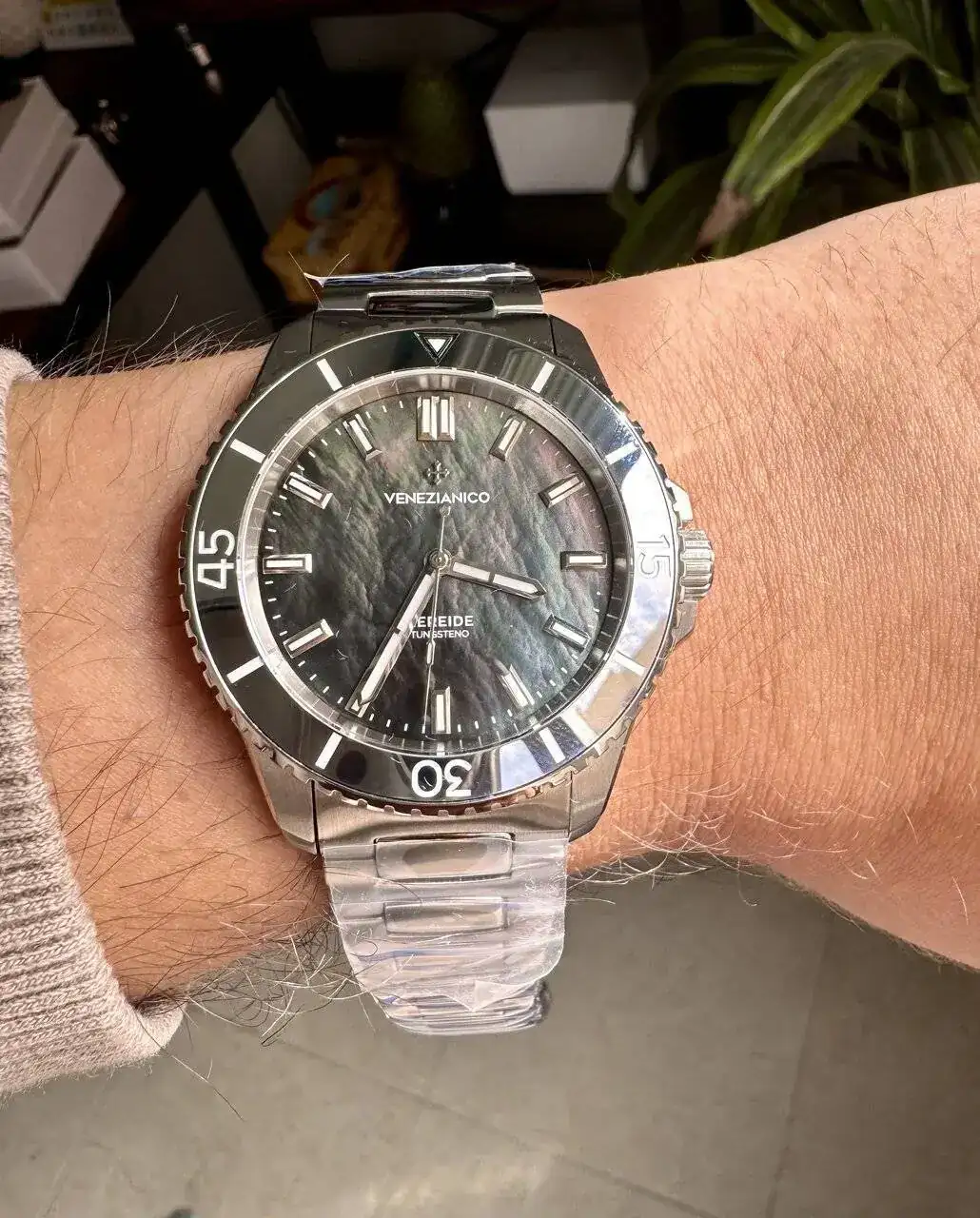 Hola a todos, pues eso, el título lo dice todo. Vi que salió el Venezianico Nereide tungsteno en 39mm con dial en madre perla. Me entró la calentada y caí. Tiene un miyota 9039 para poder tener un grosor de 10.5mm y un bisel de tungsteno. Estoy impresionado con el, si el antireflejos fuese mejor sería ideal. Os dejo unas fotos y también un enlace al modelo.