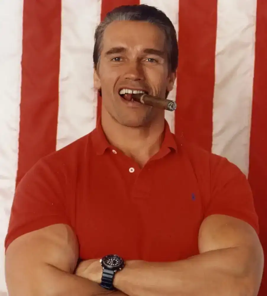 Qué barbaridad. Tenía que tener la muñeca como un tobillo porque 47mm le quedan como al resto de mortales uno de 32A quién le gusten las pelis de Arnold, que se entretenga fijándose en su muñeca la próxima vez, a ver si ve un Seiko Arnie. Lo usó tanto en la vida real: