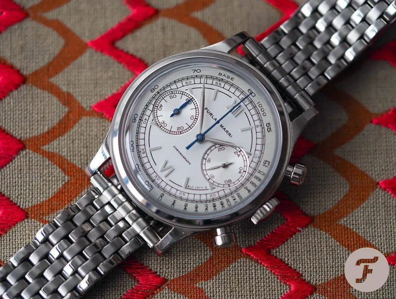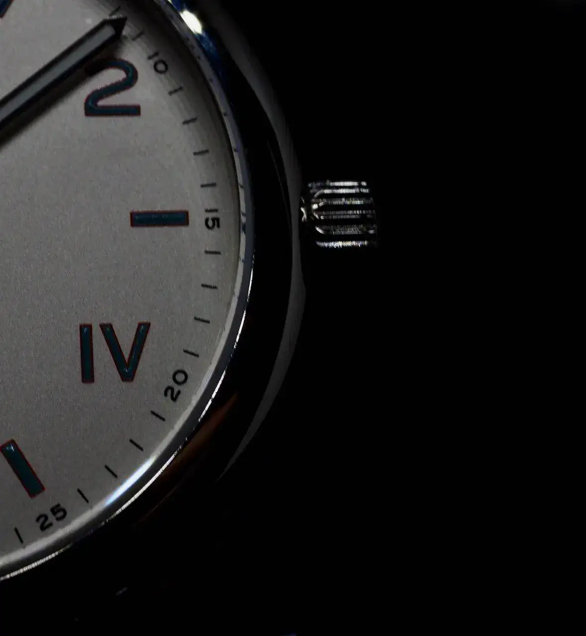 En este caso la esfera es blanca plateada, números arábigos y romanos (parecido al dial California de los PAM pero a la inversa). El ancho de asa es de 20 mm.