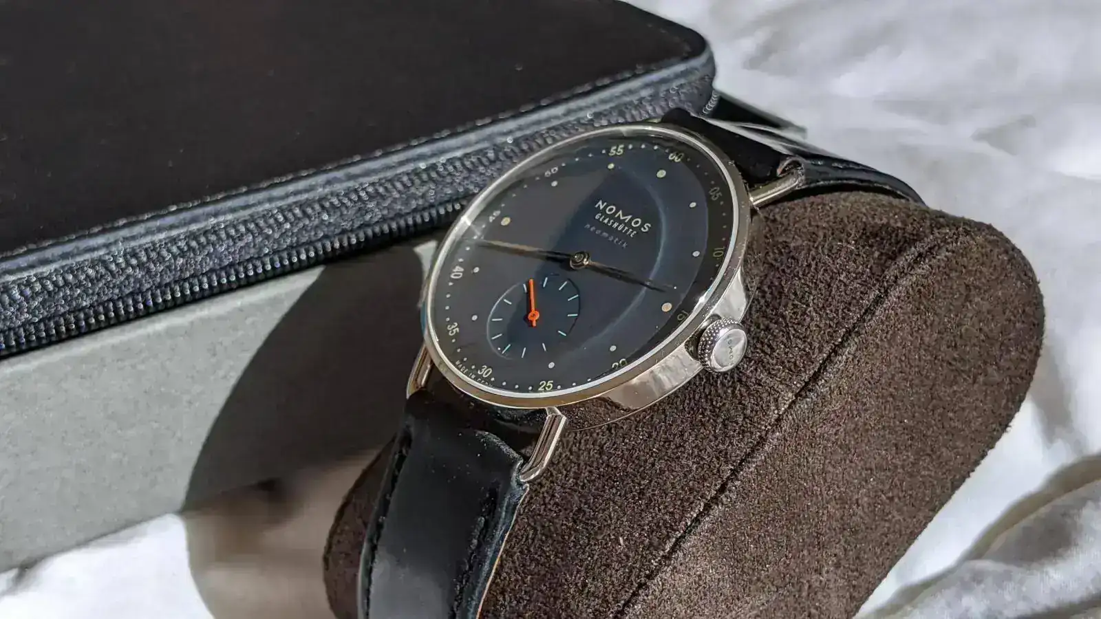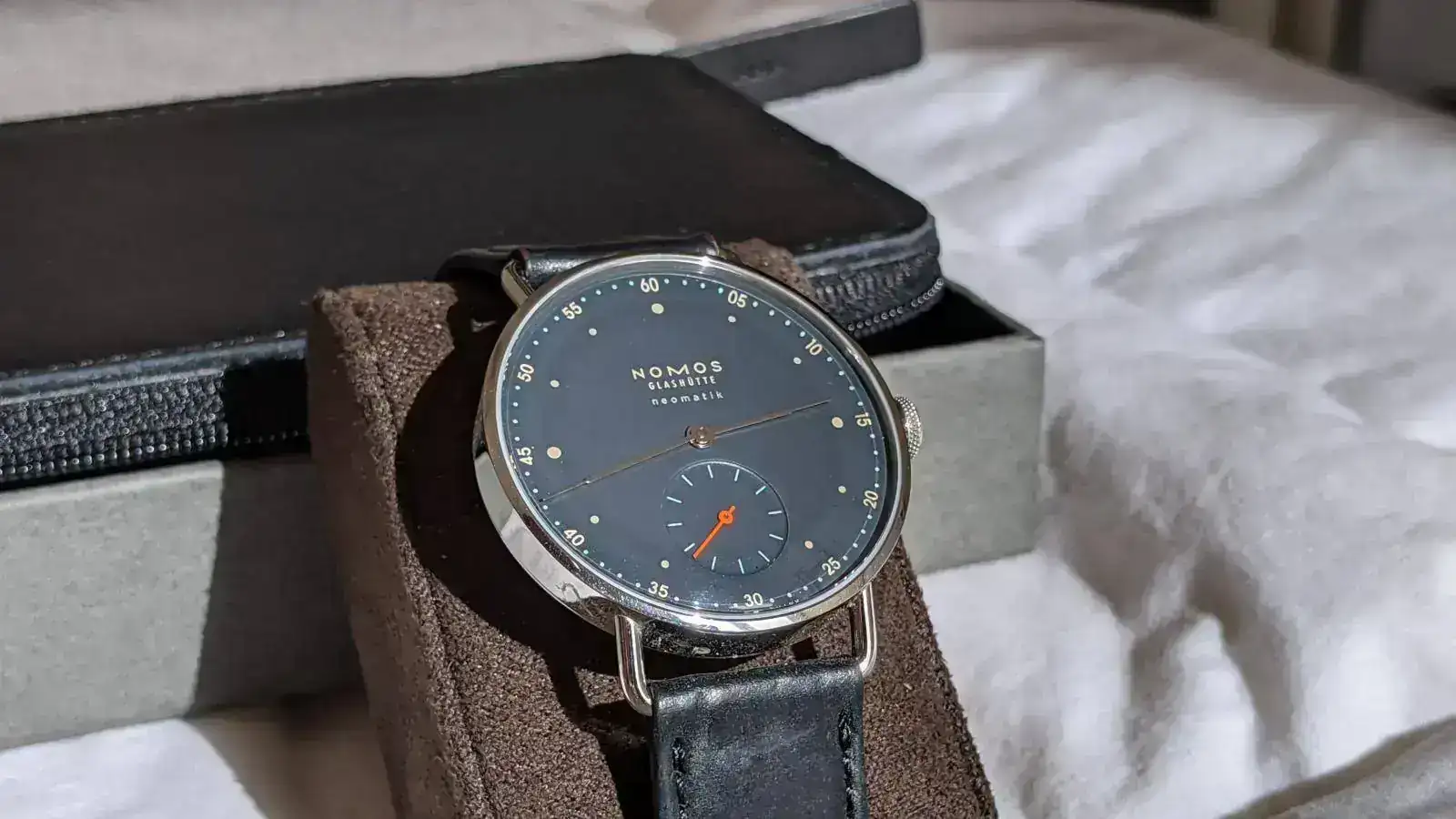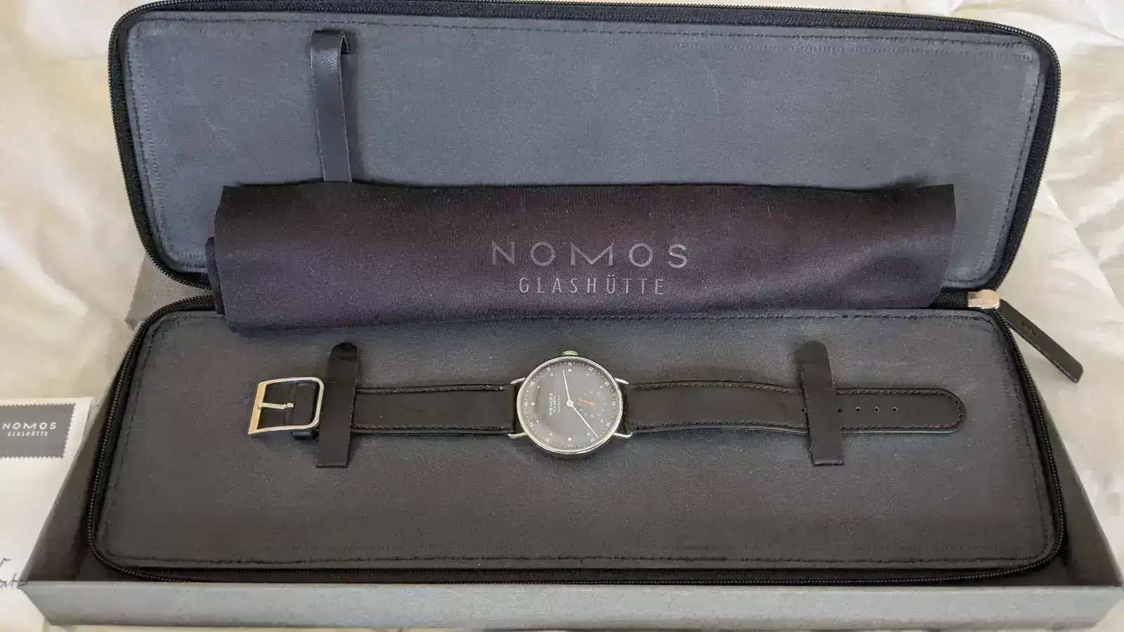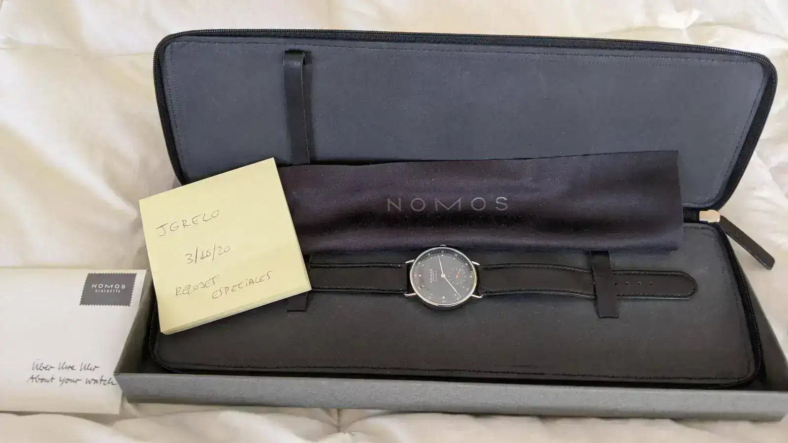 Hace algo menos de dos años me encapriché con este reloj y me lo regalé. He de decir que es espectacular, el color azul de la esfera es increíble. Además tiene un tamaño contenido, es una pieza magnífica. Pero ha llegado a mi caja una pieza mayor, y no me queda otra que hacer caja con los relojes que me pongo menos. Todavía tiene 4 meses de garantía oficial de Nomos por delante.