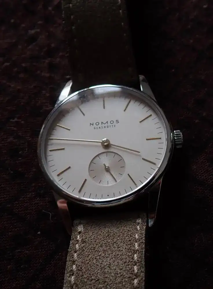 Nomos Orion Rosé 33mm, calibre manufactura manual Nomos, 8,5 mm de altura, doble zafiro, unos 1.700 precio catálogo.