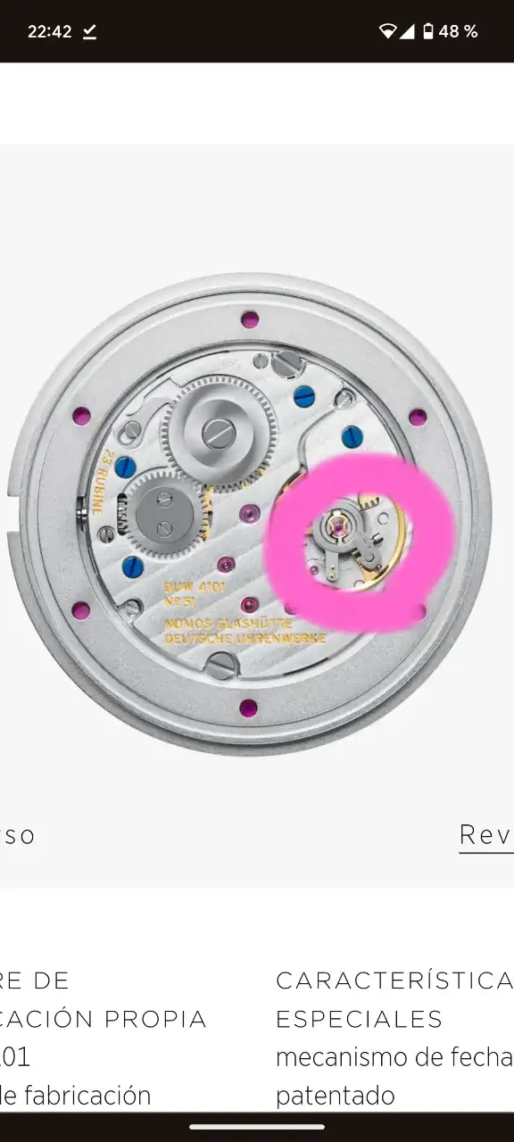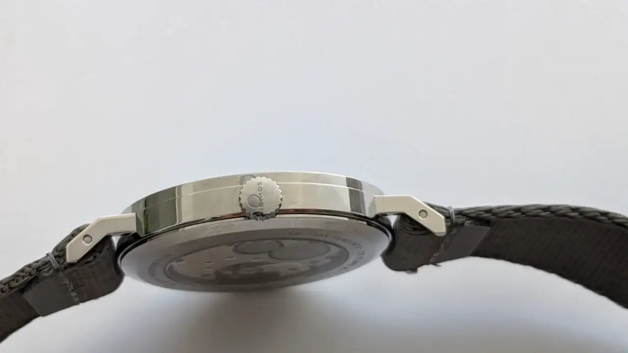 Manufactura alemana, 6,8mm altura, un formato de fecha grande que me atrae mucho, calibre manual muy bien decorado, correa textil muy acertada para mi gusto.