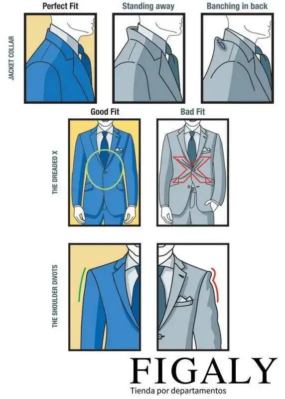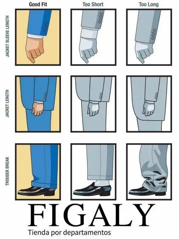 - Nunca usar un traje ni muy grande ni muy prieto. Aunque esto último parece que ahora hay algunos que no lo entienden, y que creen que lo prieto es tendencia. En caso de duda sobre la talla adecuada del traje, buscar consejo profesional