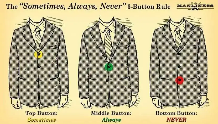 - Nunca, repito ¡ NUNCA !, se abrocha el último botón inferior de una chaqueta cruzada. Igual que en un chaleco, el último botón nunca se abotona.