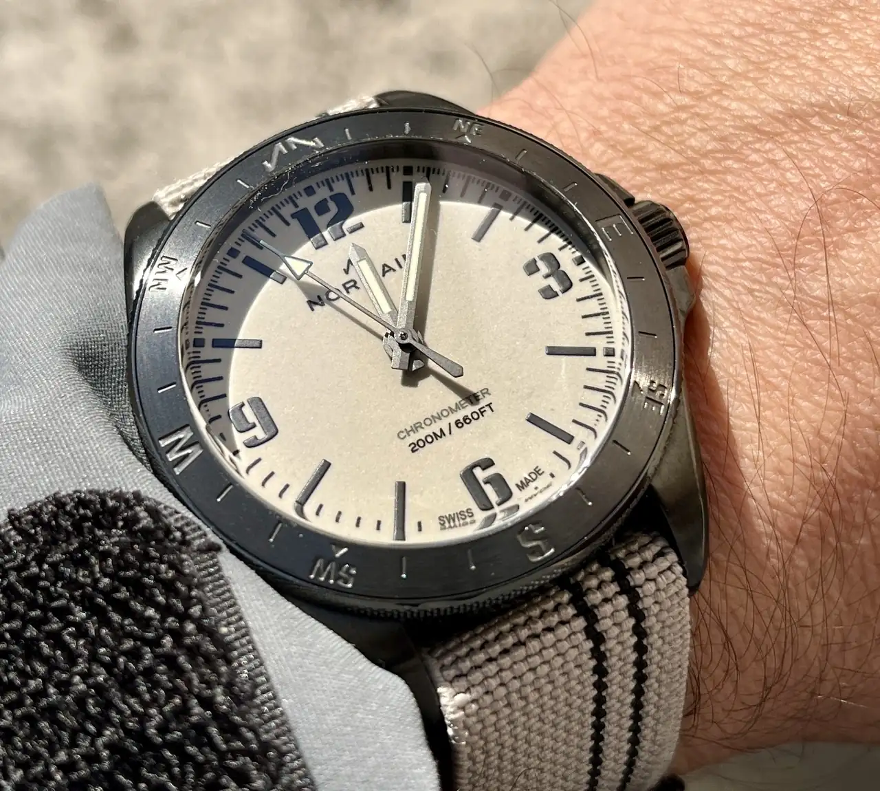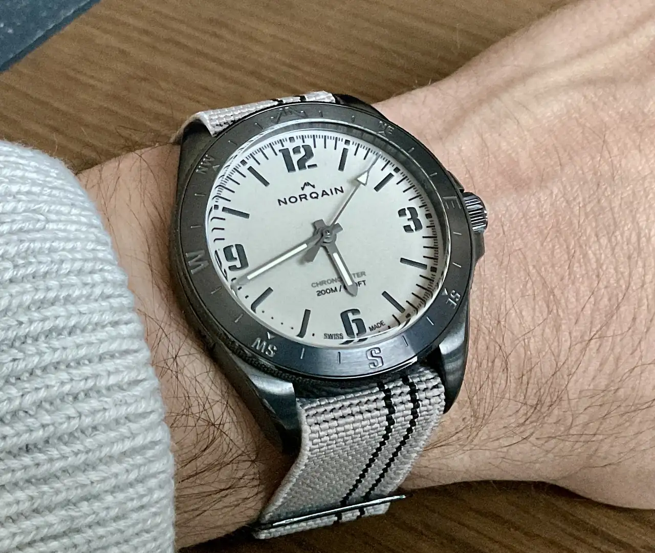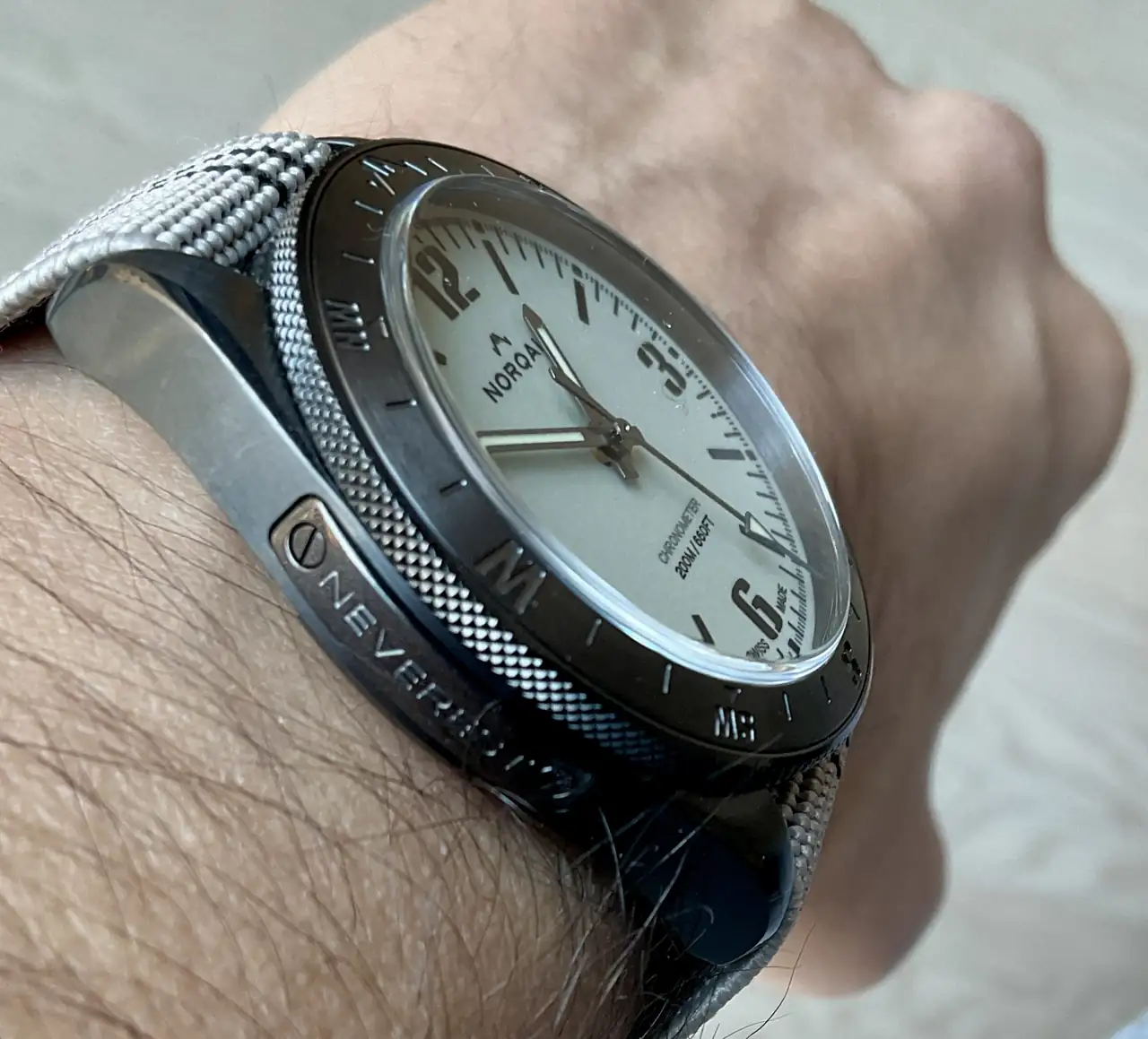 El modelo elgido fue el Norqain Neverest Night Sight. Es un reloj con una estética de tipo militar o táctica y con prestaciones de diver aunque su bisel, como se podrá apreciar por las fotos, indica los puntos cardinales ahondando en su vocación aventurera. Me atrajo el dial full lume, el acabado dlc de la caja, un tamaño contenido y un aparentemente buen calibre de Kenissi con una generosa reserva de marcha.