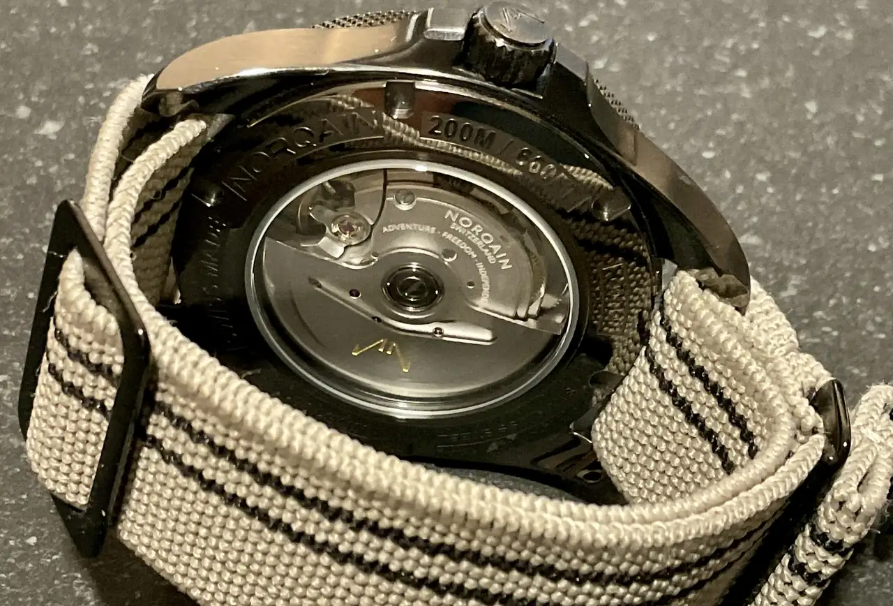 Después de esta adquisición he echado la vista atrás y no he podido evitar compararla con la anterior, el Nomos Ahoi Neomatik Atlantic de 36mm, un reloj que me encanta. Me di cuenta que dejando de lado la diferente estética tenían algunas carcterísticas en común que los hacían comparables. Los dos pertenecen a marcas sin historia detrás, calibre “in house” el Nomos, y Kenissi el Norqain (que sin ser manufactura es algo más exclusivo que un Sellita), automáticos, fondo visto, 200m, sin fecha, zafiro y con correa textil. El Norqain tiene mucho mejor lume, más reserva de marcha, mejor AR y mi sensación es que los acabados con ligeramente mejores. El calibre Kenissi es COSC y el rotor gira con mucha más facilidad que el Nomos, por lo que intuyo que será capaz de cargar con movimientos más suaves. El del Nomos está más decorado, el Kenissi que trae el Norqain es más espartano aunque me gusta también ese look industrial. Si vamos al precio, el Norqain me salió 500 euros más barato.