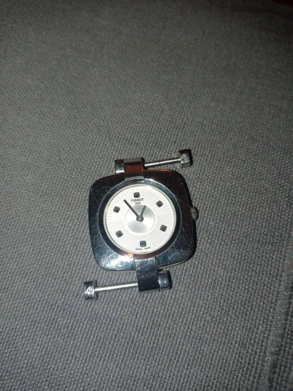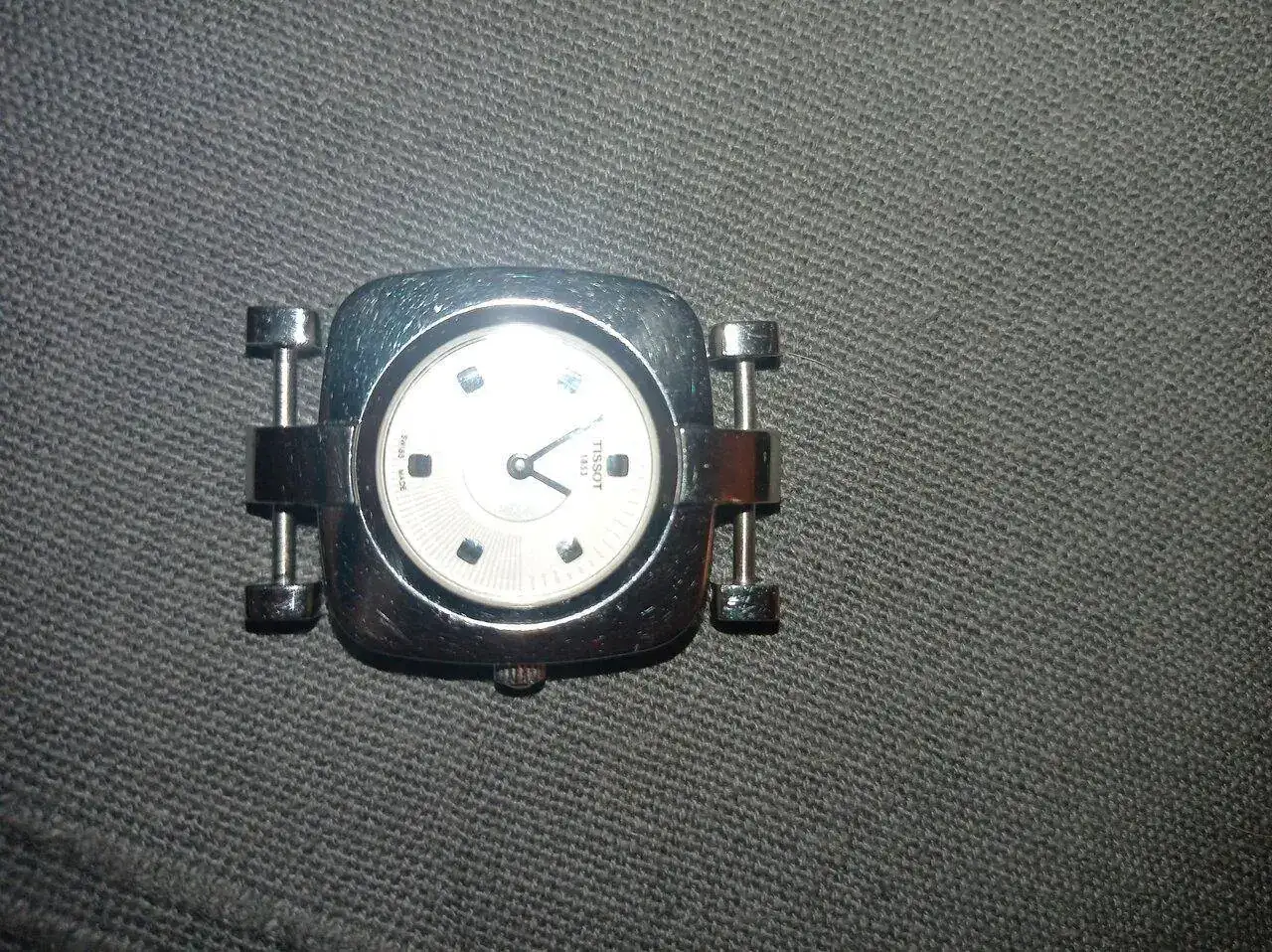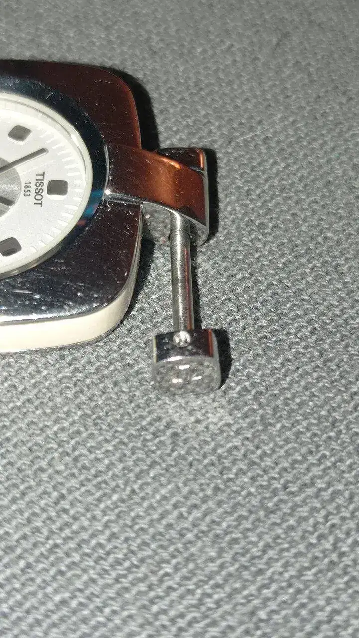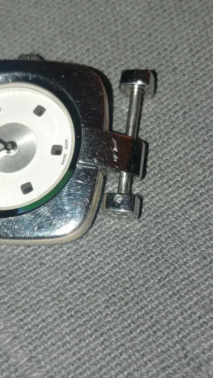 Opté por llevarlo a una joyería para pedirles que me adaptasen una correa. Simplemente había que desmontar los dos ejes que la sostienen y hacer una hendidura central para adaptarlo a la caja. Alguna mano inexperta borró la cabeza de uno de los tornillos al intentar abrirlo, por lo que uno de esos ejes no puede abrirse. Me dijeron que "no tenía arreglo".