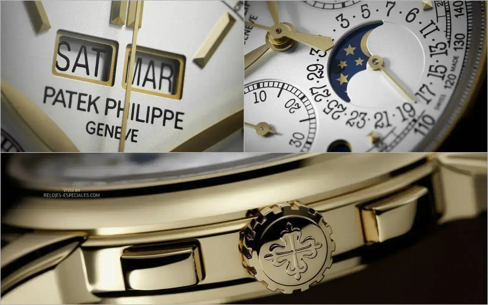 La esfera opalina plateada, con índices “bastón” aplicados y agujas “hoja” de oro amarillo, destaca por su gran legibilidad. Las indicaciones del calendario perpetuo presentan un diseño muy equilibrado, con fechador de aguja en posición 6h y doble ventanilla día/mes a las 12h, completadas con dos pequeñas aberturas redondas para la indicación día/noche y el ciclo de los años bisiestos –además de una ventanilla para las fases de luna. Las indicaciones del cronógrafo se distinguen por sus agujas con acabado arenado. La escala taquimétrica permite medir velocidades horarias, en conjunción con el cronógrafo.