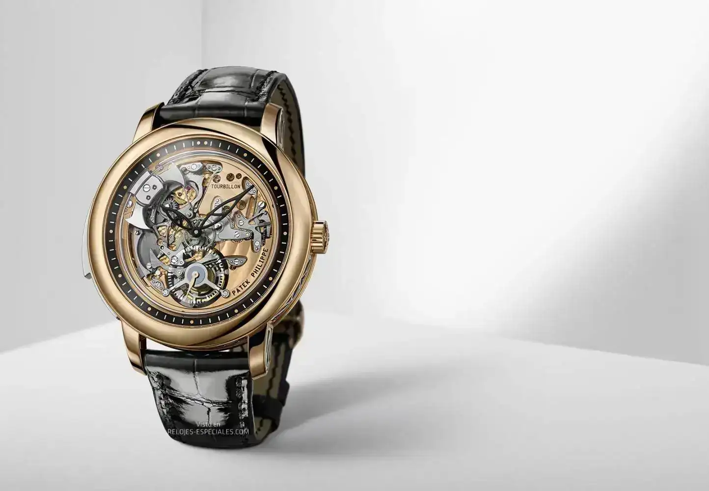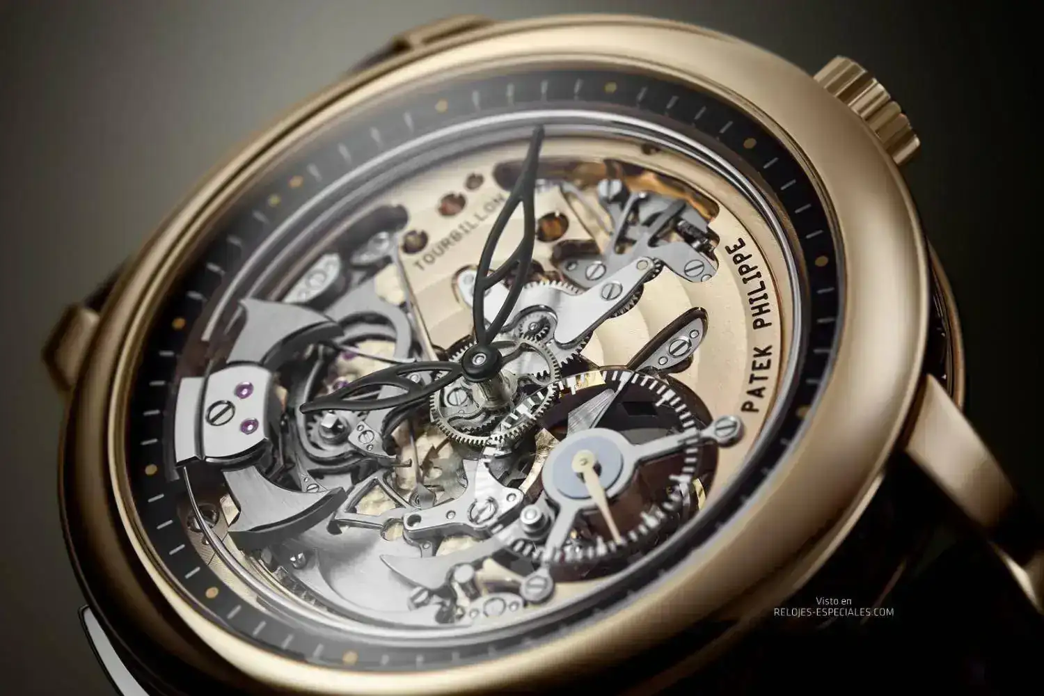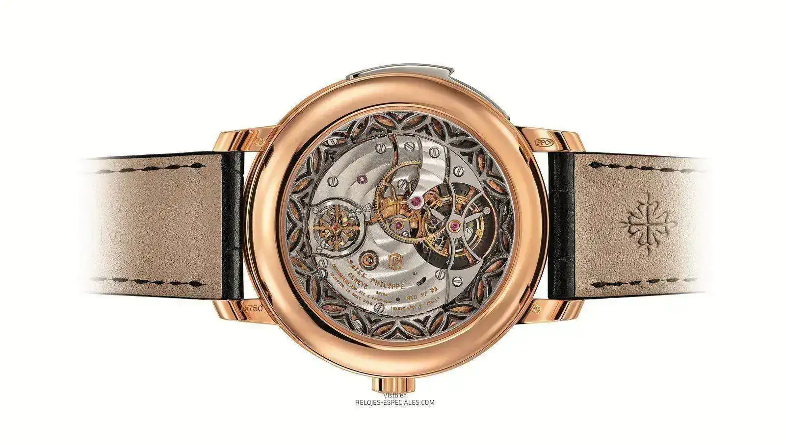 El 5303R-001 presenta una geometría abierta, sin esfera, que permite admirar el mecanismo de repetición de minutos en funcionamiento con el reloj puesto. Además, puede apreciarse la parte posterior de la jaula del tourbillon a través del contador del pequeño segundero a las seis. Se ha retrabajado la estética del calibre R TO 27 PS de carga manual mediante la presencia de detalles calados en algunas piezas, como si se tratara de un movimiento tipo esqueleto. Todo, obviamente, con acabados a mano que incluyen una pletina decorada con “Côtes de Genève” circulares, concavidades con decoración perlada y martillos realzados con un fino satinado circular.