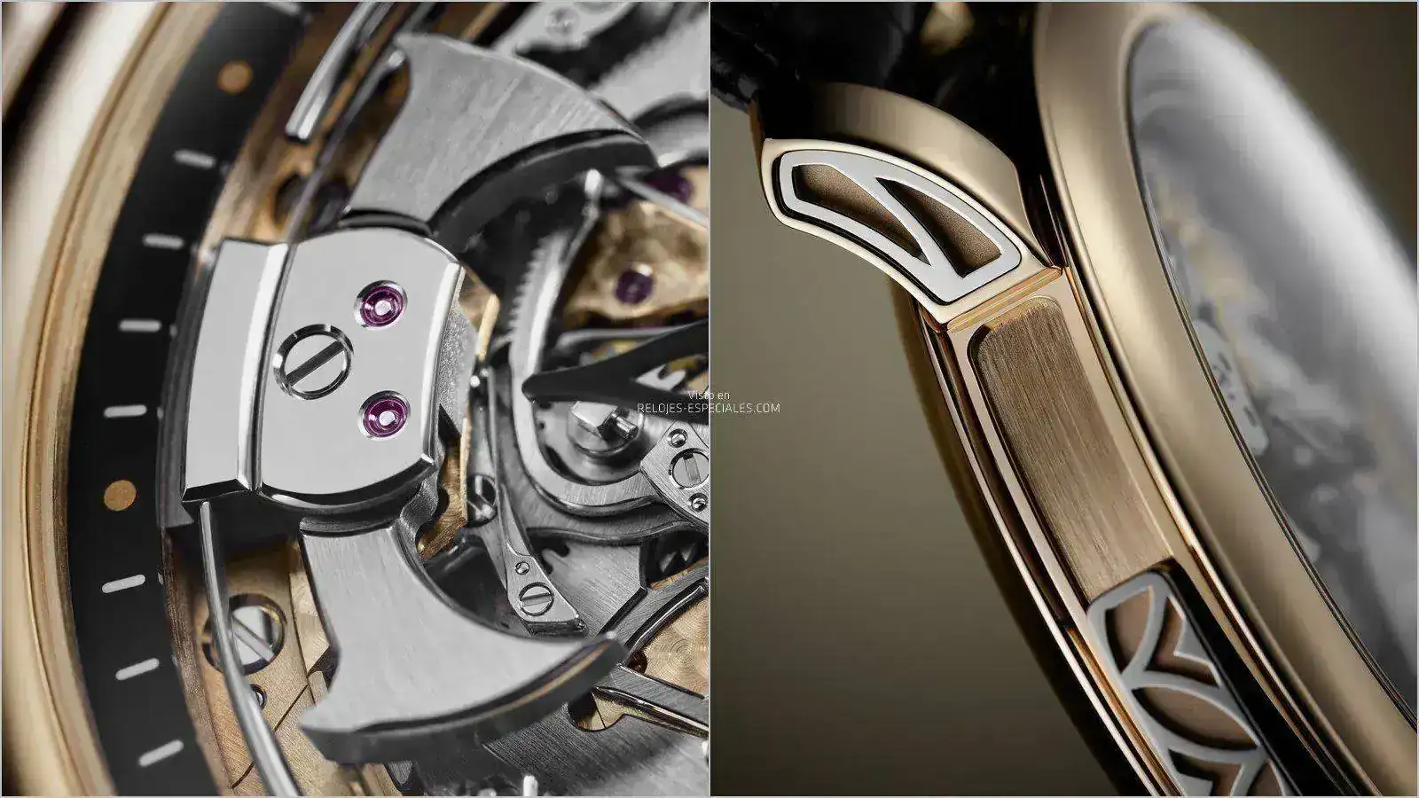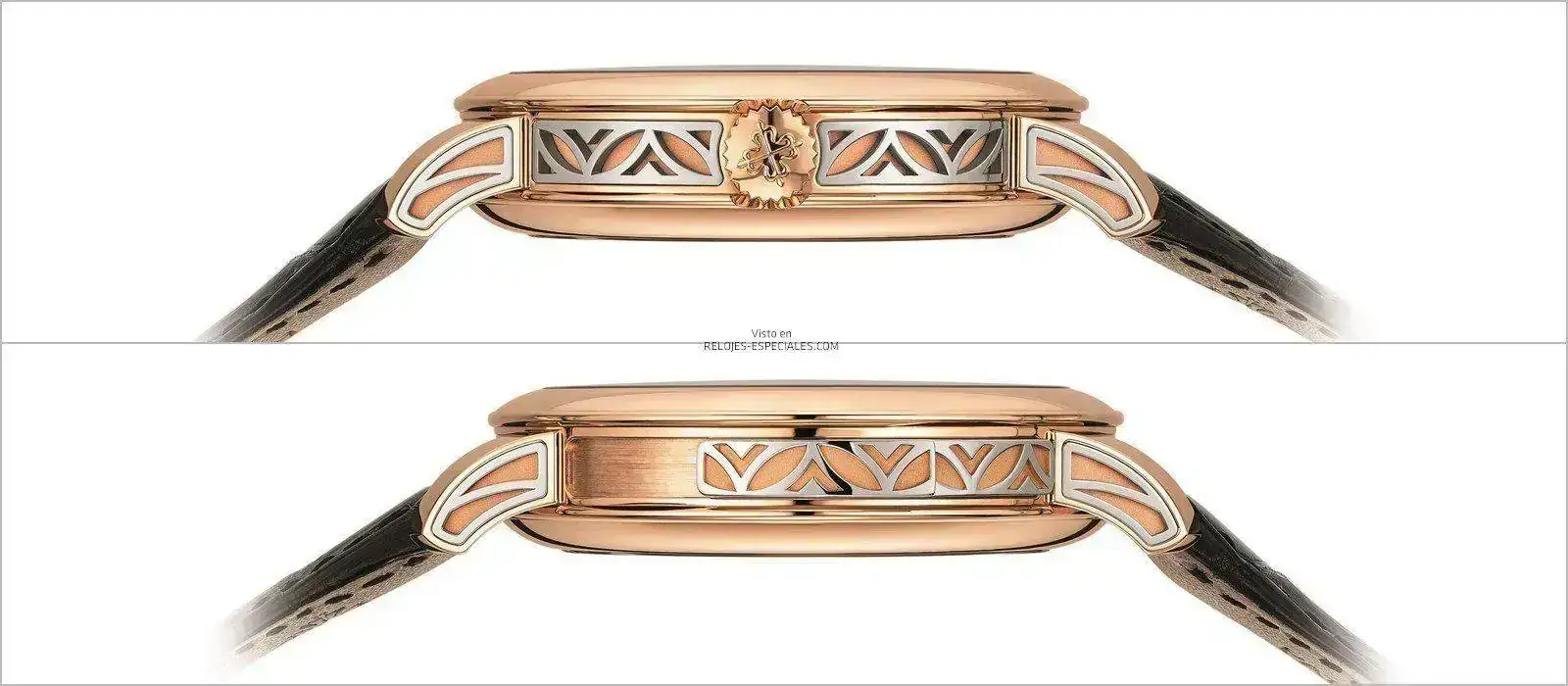 La caja de oro rosa destaca por su ancha carrura cóncava y pulida así como por sus inserciones en oro blanco con decoración “hoja” grabada en los laterales del canto y de las asas del brazalete. El gatillo de oro blanco que permite activar el mecanismo de repetición de minutos, en el lado izquierdo de la caja, ostenta el mismo motivo. El círculo horario se presenta como un anillo de cristal de zafiro lacado negro con puntos de oro rosa. La vista del movimiento por el lado del fondo, a través de un cristal de zafiro, va enmarcada por un semicírculo en oro blanco decorado con un motivo perforado que recuerda el calado de las inserciones y el gatillo.