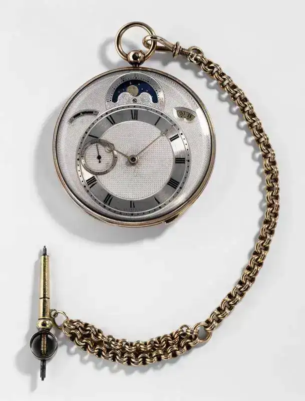 Agujas Breguet à pomme évidée. Indicación de las fases y la edad de la luna a las 12 h. Indicación de la fecha a las 2 h. Indicación del día de la semana a las 10 h. Segundero pequeño a las 5 h.