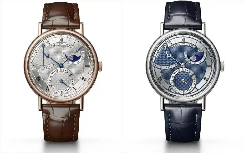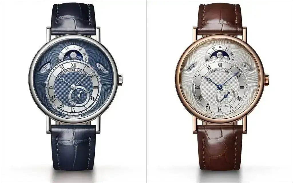 Por su parte, las esferas excéntricas, introducidas hacia 1812 en algunos relojes de bolsillo, constituyen una importante innovación estilística. Así, el repetición de cuartos N° 3833, vendido en 1823 y expuesto en el Museo Breguet de París, presenta una circunferencia de las horas desplazada a la altura de las VI horas, coronada por la indicación de las fases de la luna a las XII horas, una disposición que hereda el nuevo Classique 7337 aunque con ligeras variaciones.