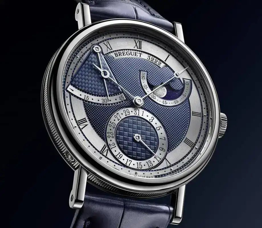 Esfera azul de oro de 18 quilates, guilloché a mano. Circunferencia de las horas con números romanos. Agujas Breguet à pomme évidée.
