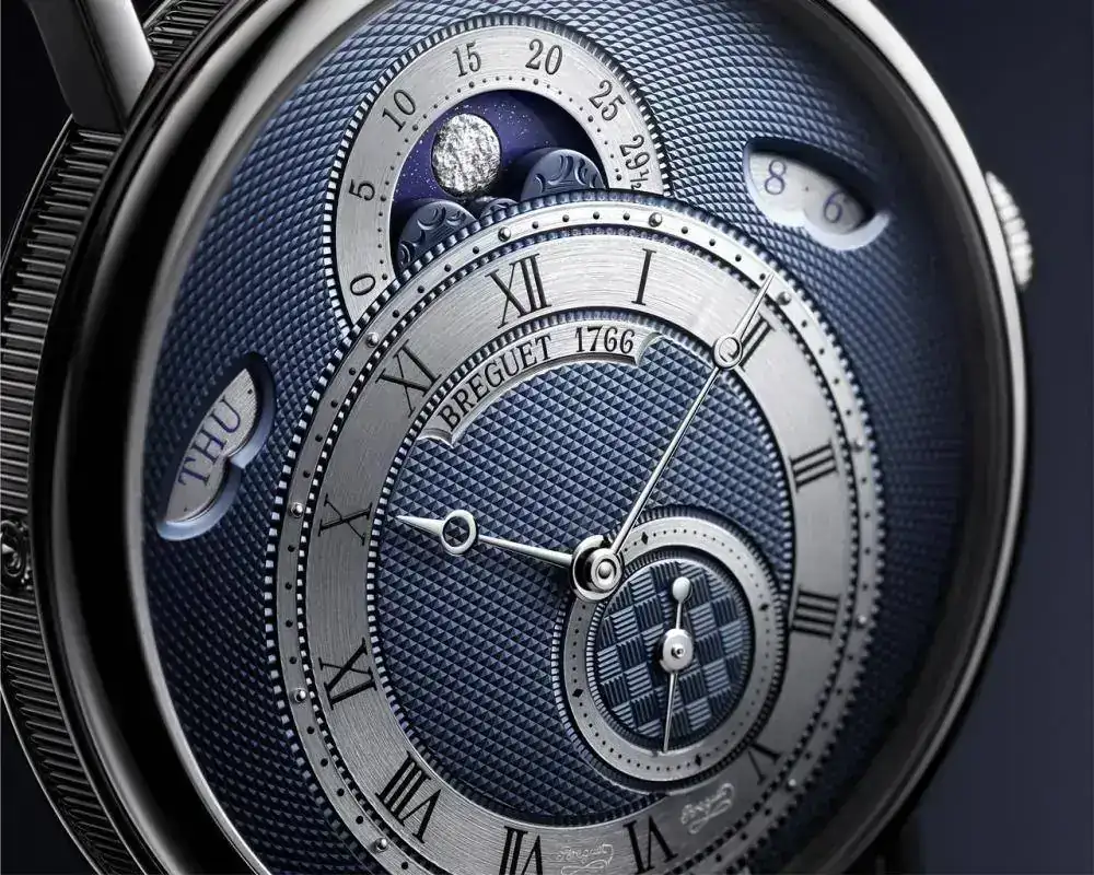 Esfera azul de oro de 18 quilates, guilloché a mano. Numerada y firmada Breguet individualmente. Circunferencia de las horas con números romanos excéntrica a las 6 h, guilloché.