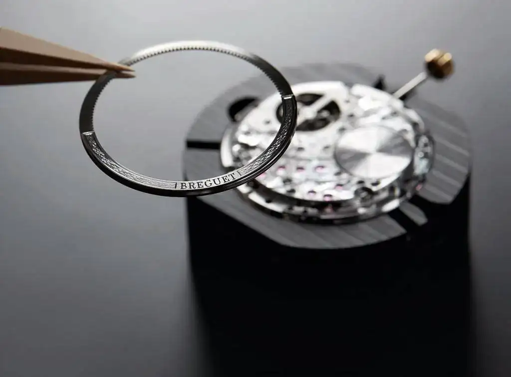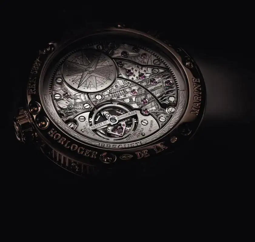 Una representación del buque insignia de la Marina francesa, el Royal Louis, ornamenta los puentes del movimiento que quedan a la vista gracias al fondo transparente. Repartido sobre cuatro puentes, el diseño cobra vida gracias a unos minuciosos detalles cincelados sobre cada uno de ellos. El trabajo debe ser muy preciso para que los trazos de la imagen se alineen perfectamente al montar el movimiento. El tambor del barrilete luce una rosa de los vientos igualmente grabada a mano. La masa oscilante periférica de platino, guilloché y grabada con el nombre Breguet, permite una vista totalmente abierta sobre el conjunto del movimiento y su decoración. Puedes ver parte del proceso