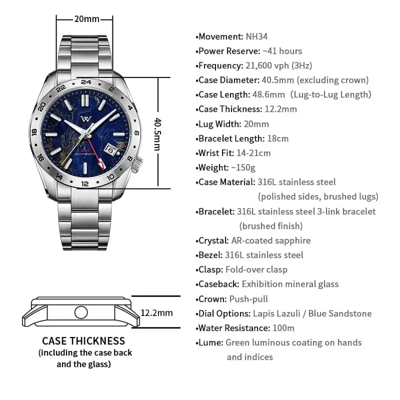 , pero fuera de eso, el reloj caja de acero, corona y trasera roscada , NH35 , 36mm de diametro, 20mm de asas.