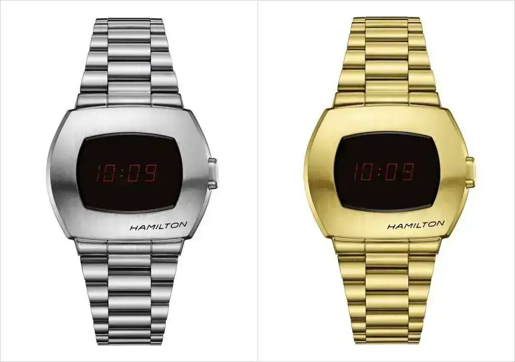 Con el nuevo PSR Hamilton quiere revivir este icono del estilo y la tecnología de los años 70. El Hamilton PSR está disponible en dos versiones: una de acero inoxidable (referencia H52414130, PVPR 695 €) y la otra de acero inoxidable con recubrimiento de PVD oro amarillo, limitada a 1970 piezas (Referencia H52424130, PVPR 945 €).