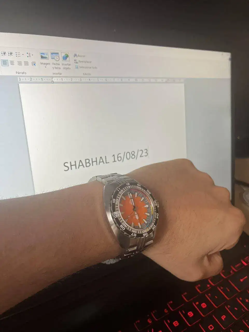 NTH Devilray Naranja. Diver 50 atm 500 metros. Escala de profundidad en el dial, lumen superluminova que es un espectaculo. 43,5 mm pero muy contenidodebido a su corta distancia entre asas. Se entrega con su armis, una milanesa gruesa y de calidad y la ristra de correas y natos de las fotos.