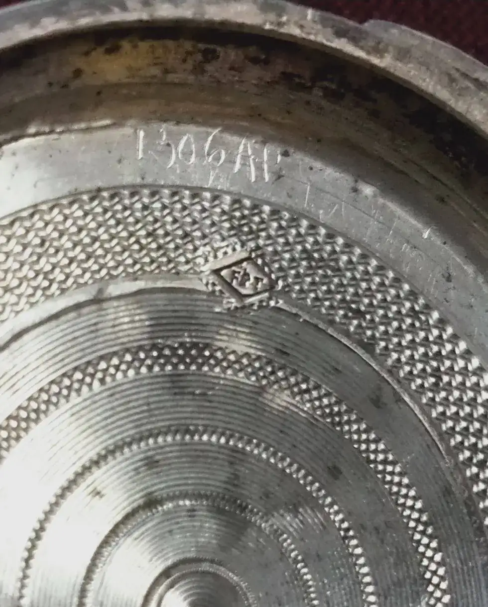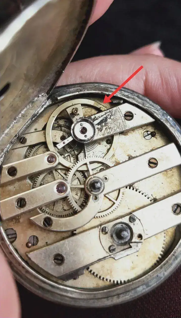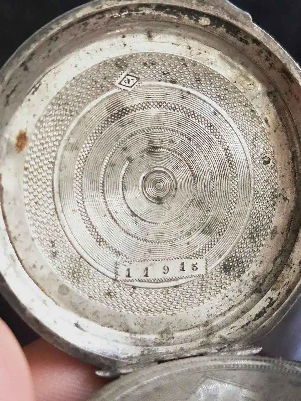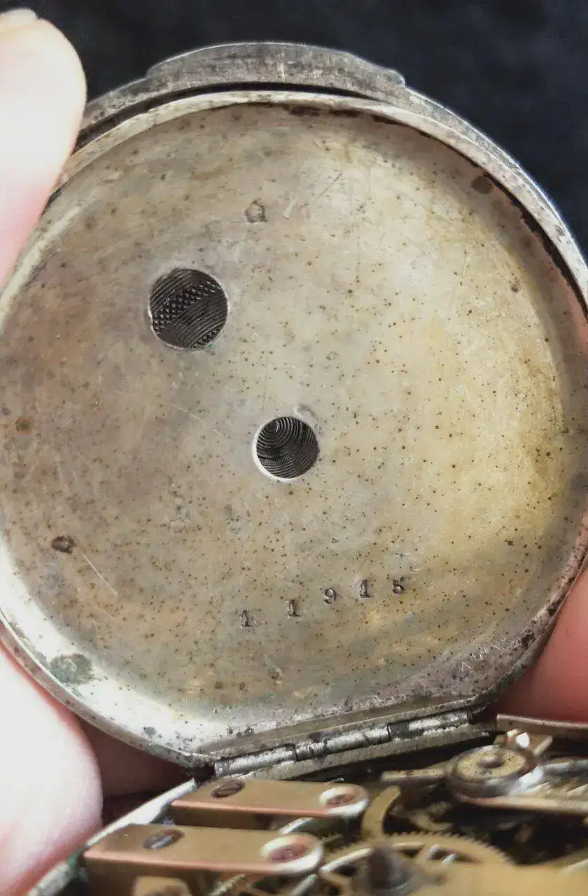 La otra tapa tiene la inscripción "Cylindre huit rubis", y dos agujeritos para darle cuerda con llave y cambiar la hora. En su interior de nuevo los números 11915.