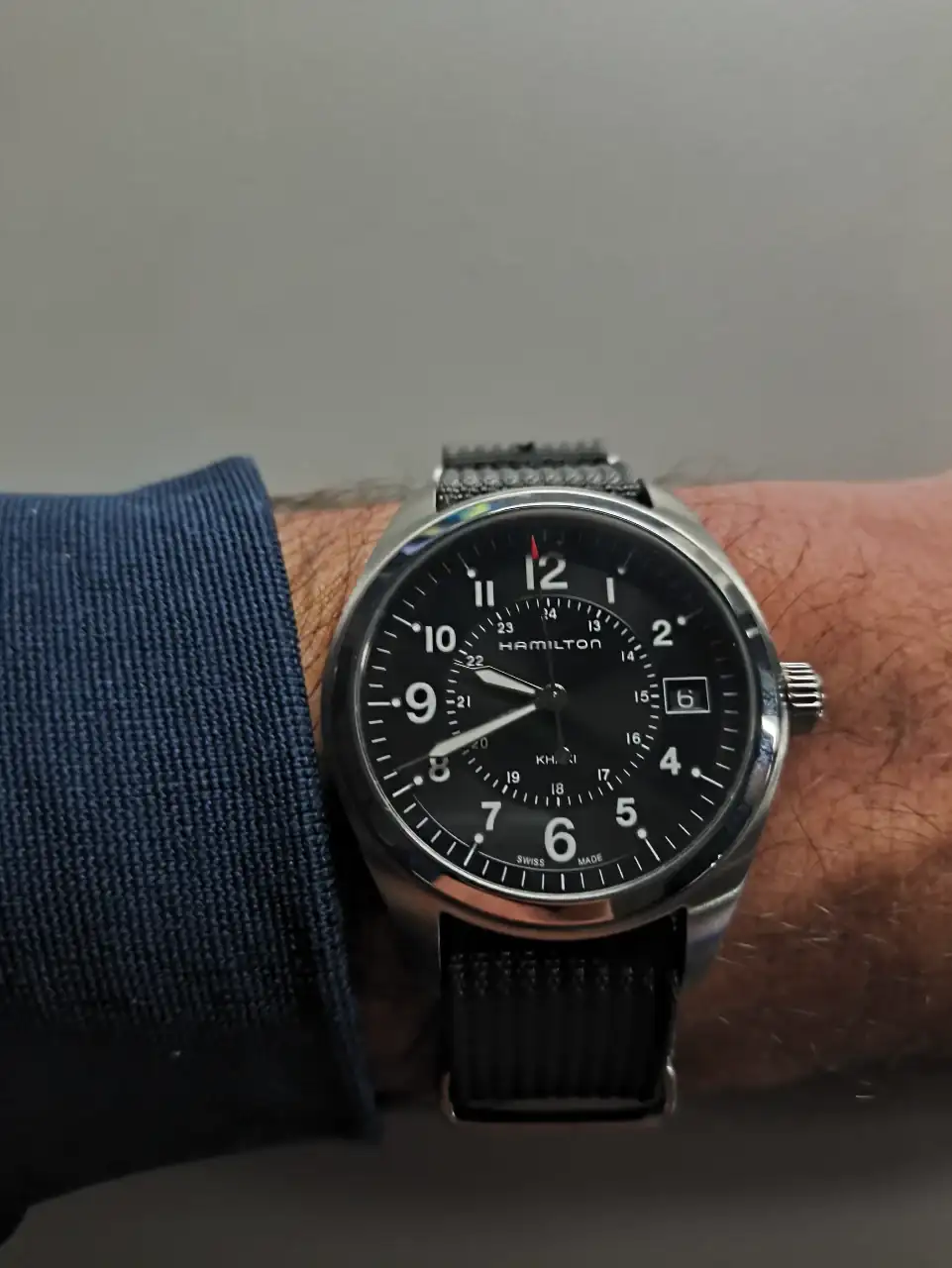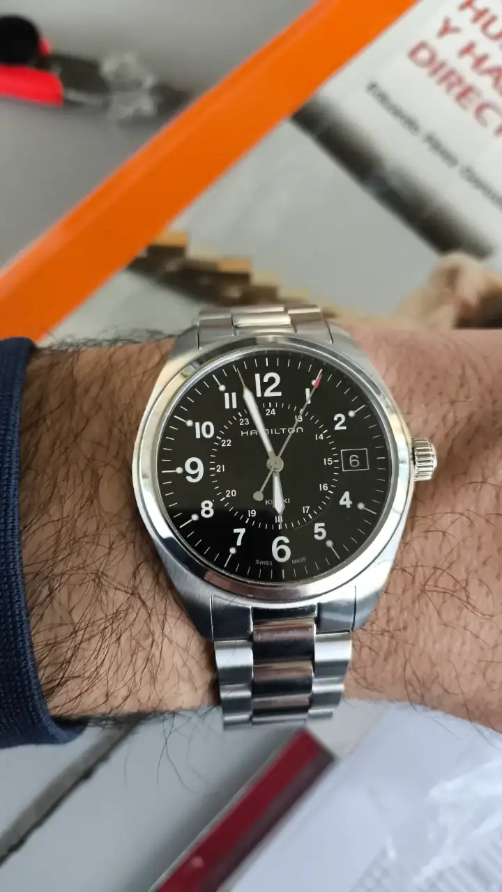 Buena elección! Un reloj todo terrenoBuenas noches compañeros, vengo a confesarme que he pecado 🤣, el caso es que este año me prometà a mà mismo tener un año tranquilo, me marque como objetivo principal algo que sabia que iba a ser difÃcil de cumplir(un Tudor Pelagos o un Omega) pero me intentaba autoengañar para ver si fijándome un objetivo difÃcil de conseguir no me perdÃa picando por el camino, pero la carne es débil y uno es de gatillo fácil relojerÃlmente hablando y no me he podido resistir, si otra vez, hace unas semanas cayó el precioso Glycine Combat sub 39 azul, el cual siempre se veÃa relegado a otras entradas, siempre siendo el eterno aspirante a entrar en la caja pero el mes pasado encontré una unidad impoluta a buen precio y acabé picando. Pues estos dÃas me ha vuelto a pasar, prometo que mi objetivo es reducir caja, de hecho han salido 3 relojes ya este año, pero lamentablemente ya llevo dos entradas en estos dos primeros meses del año. El nuevo protagonista en cuestión es un reloj de cuarzo, si no me matéis los puristas, me gustan muchÃsimo los automáticos y mecánicos, pero no le hago ascos a un buen cuarzo y en este caso en particular descartando totalmente pagar lo que vale este modelo en movimiento automático y viendo el precio al que se me cruzó no me pude resistir. El reloj en cuestión es el archiconocido Hamilton Khaki Field en este caso de 40mm y cuarzo. Espero que a los que halláis aguantado la parrafada os gusten las humildes fotos de la presentación.Ver el archivos adjunto 2995325Ver el archivos adjunto 2995326he decidido equiparlo con esta nato que tenÃa de mi Cap. Willard la que creo que le pega más que el armis metálico que trae de serie. espero que os guste, un saludo!Ver el archivos adjunto 2995327
