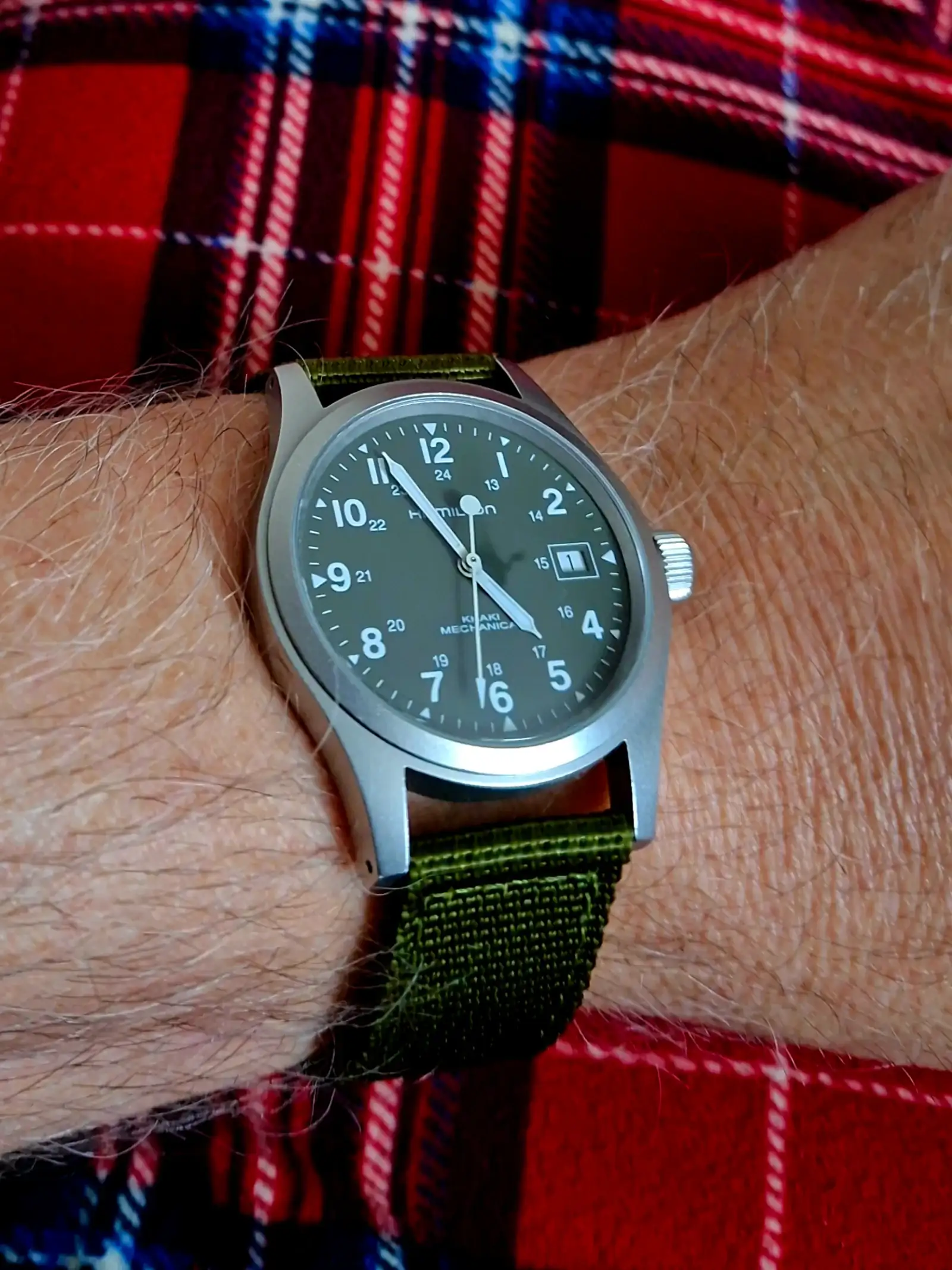 Bueno, pues llegó un reloj que tuve hace ya algunos años y es de esos que, una vez que no lo tienes, lo echas a faltar. Ese ha sido el caso del Khaki Mecánico, y es por ello que lo he vuelto a introducir en la colección. El reloj viene proveniente de un cambio por otro reloj; el mío era nuevo y el del compañero en cuestión tiene un año, pero se nota que no tuvo feeling con él los dos o tres días que lo llevó, porque, como me dijo, está prácticamente igual que nuevo, sin una marca en todo el reloj, la correa perfecta y con toda su dotación.