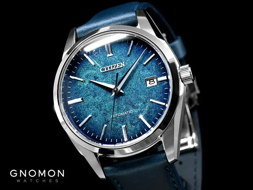 Manecillas Dauphine, índices de bastón aplicados con doble bastón a las 12, ventana de fecha enmarcada a las 3 con fondo "blanco" (para mi gusto tiende al gris claro tono metálico), cristal de zafiro esférico doble con revestimiento no reflectamente y un dial texturizado que es el gran protagonista en tonos marinos con bordes oscuros. La esfera de base metal está lacada pintada con aerosol por capas, antes de pasar por el horno a gran temperatura y una vez enfriada, pueda ser pulida cuidadosamente a mano para darle ese brillo que tiene. Cada esfera es ligeramente diferente al resto, por lo que no hay dos claramente iguales (o quizás sí, pero eso lo dictaminará la diosa fortuna). Lamentablemente, no he encontrado imágenes del proceso para entenderlo mejor en detalle.