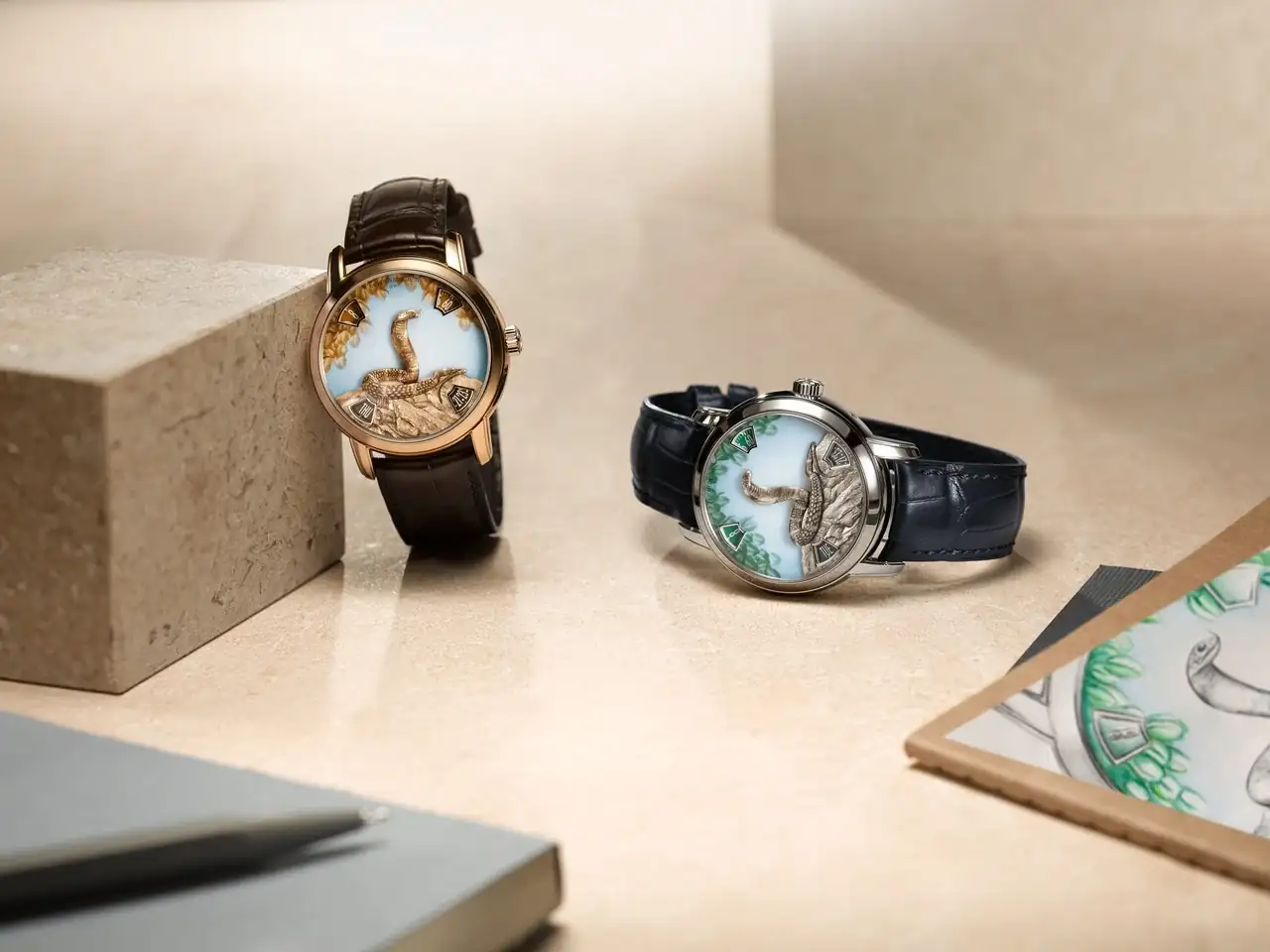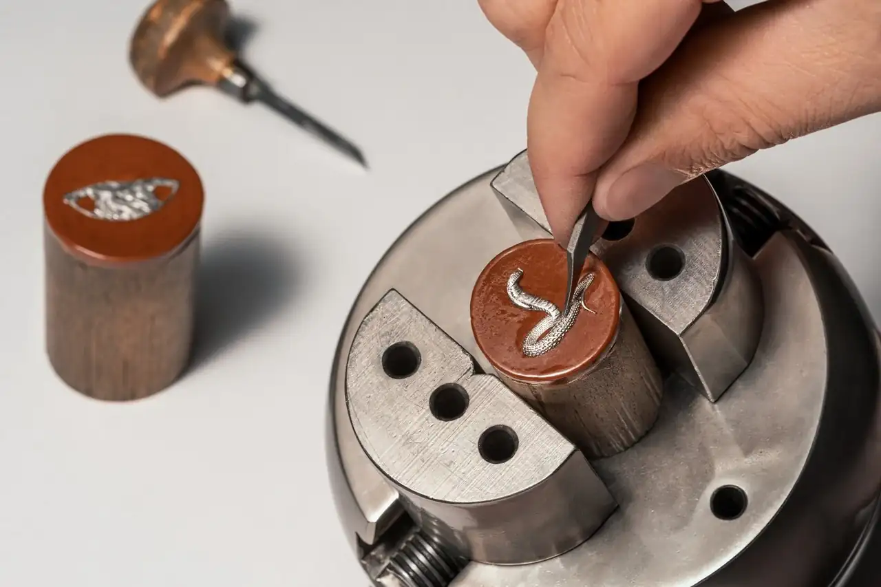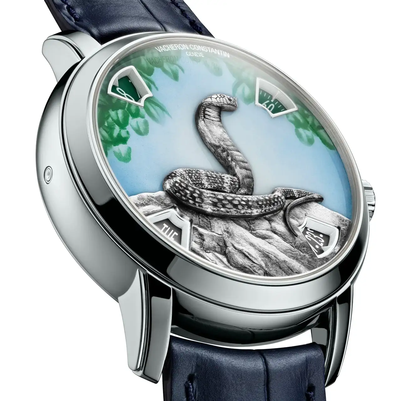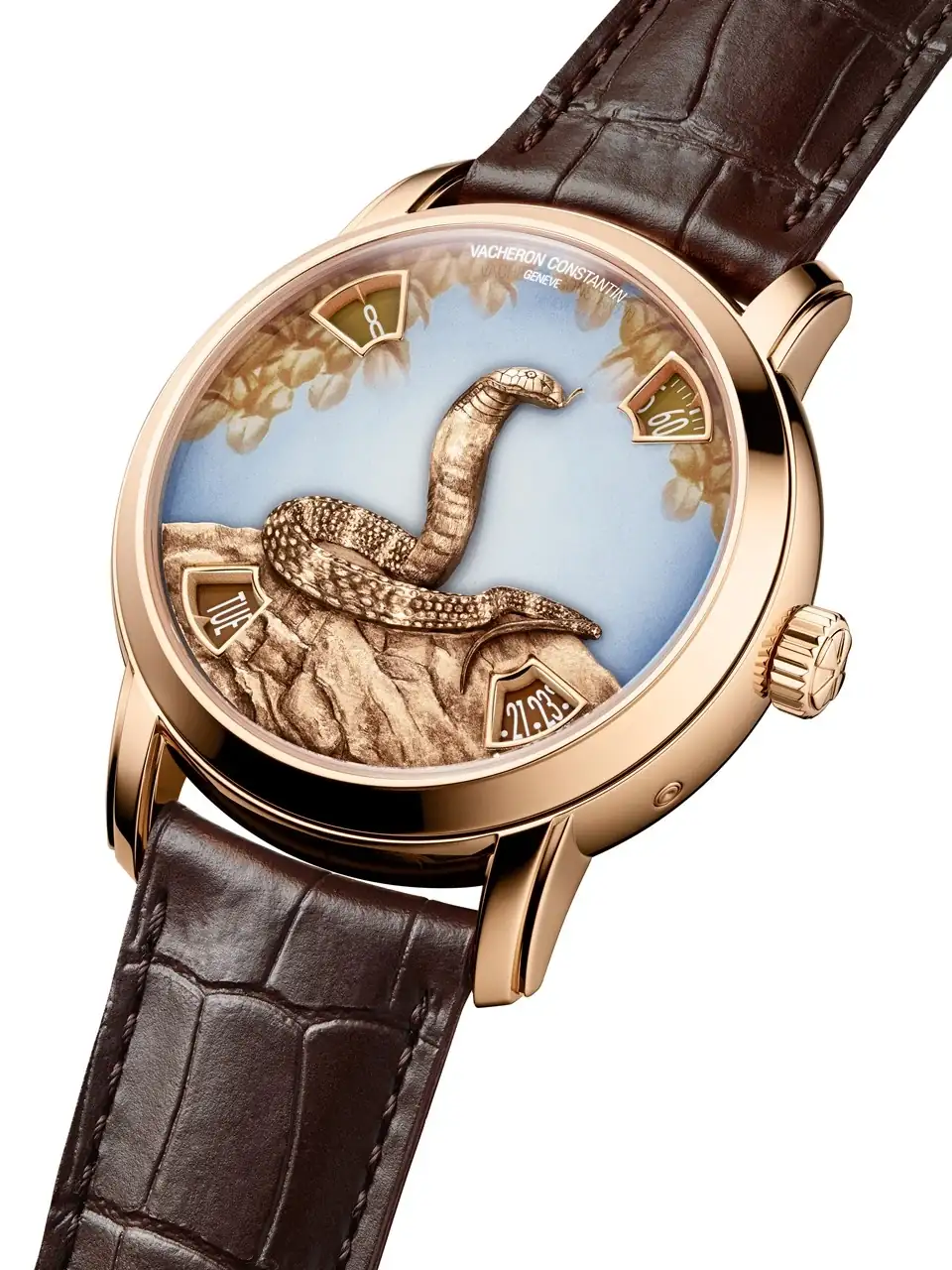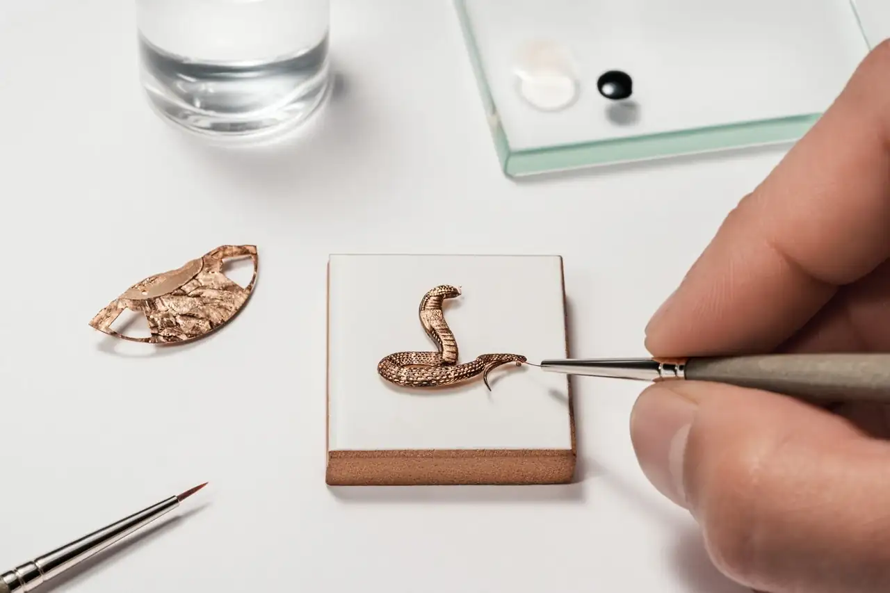 Este nuevo ciclo demostrará durante los próximos doce años toda la diversidad de la artesanía, cuyas técnicas más avanzadas se dominan a la perfección en la Maison como las habilidades combinadas del artesano grabador y del artesano esmaltador. El fruto de sus talentos adopta la forma de una obra en miniatura en la que una cobra despliega su sinuoso cuerpo sobre una roca. Estos dos apliques de oro fueron creados por el maestro grabador, que talló con maestría el metal precioso en oro rosa o blanco para crear su textura final, utilizando una hábil mezcla de fuerza y delicadeza. Se necesitan tres días de trabajo para esculpir la serpiente y la roca, cuya textura y relieve se realzan con la aplicación de pintura y pátina en miniatura. En la versión de oro rosa, la cobra y la roca son de color ocre, mientras que en la versión de platino son de color gris antracita. Como detalle final, los colores elegidos para las indicaciones que aparecen en las cuatro ventanillas coinciden con los motivos de la esfera adornada con pinturas en miniatura.