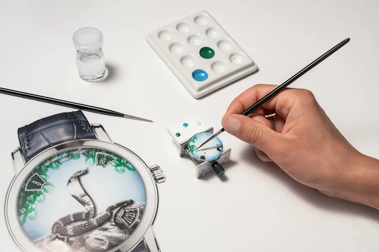 Para crear la decoración, Vacheron Constantin recurrió al talento de un maestro esmaltador. Se eligieron dos técnicas. La primera es en esmalte Grand Feu degradado para el fondo de la esfera, mientras que la segunda es una técnica ancestral de Ginebra, el esmalte opaco en miniatura recubierto de fundente para la flora. Para pintar la decoración, el maestro esmaltador aplica polvo de esmalte del color elegido sobre la superficie de la esfera con un pincel extremadamente fino. Cada aplicación de color requiere una cocción en un horno a una temperatura de entre 820°C y 850°C. Esta operación se repite tantas veces como sea necesario para cubrir toda la gama de colores del diseño. Las esferas del Métiers d'Art La Leyenda del Zodíaco Chino - Año de la Serpiente revelan así un finísimo degradado de matices entre el centro y la periferia, engalanado con delicados follajes teñidos de tonos ocres en la versión de oro rosa y verdes en la edición limitada de platino.