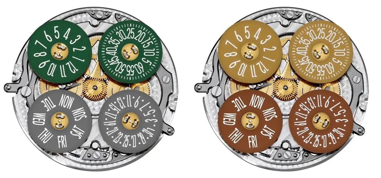 Ambos modelos están animados por el Calibre interno 2460 G4,que se distingue por una indicación única de las horas, los minutos, el día y la fecha mediante cuatro discos visibles a través de aberturas situadas alrededor de la periferia de la esfera con indicaciones de arrastre para las horas y los minutos junto con indicaciones saltantes para el día y la fecha. En el fondo de la caja, un cristal de zafiro revela la masa oscilante de oro de 22 quilates adornada con un motivo guilloché, así como los componentes del movimiento.