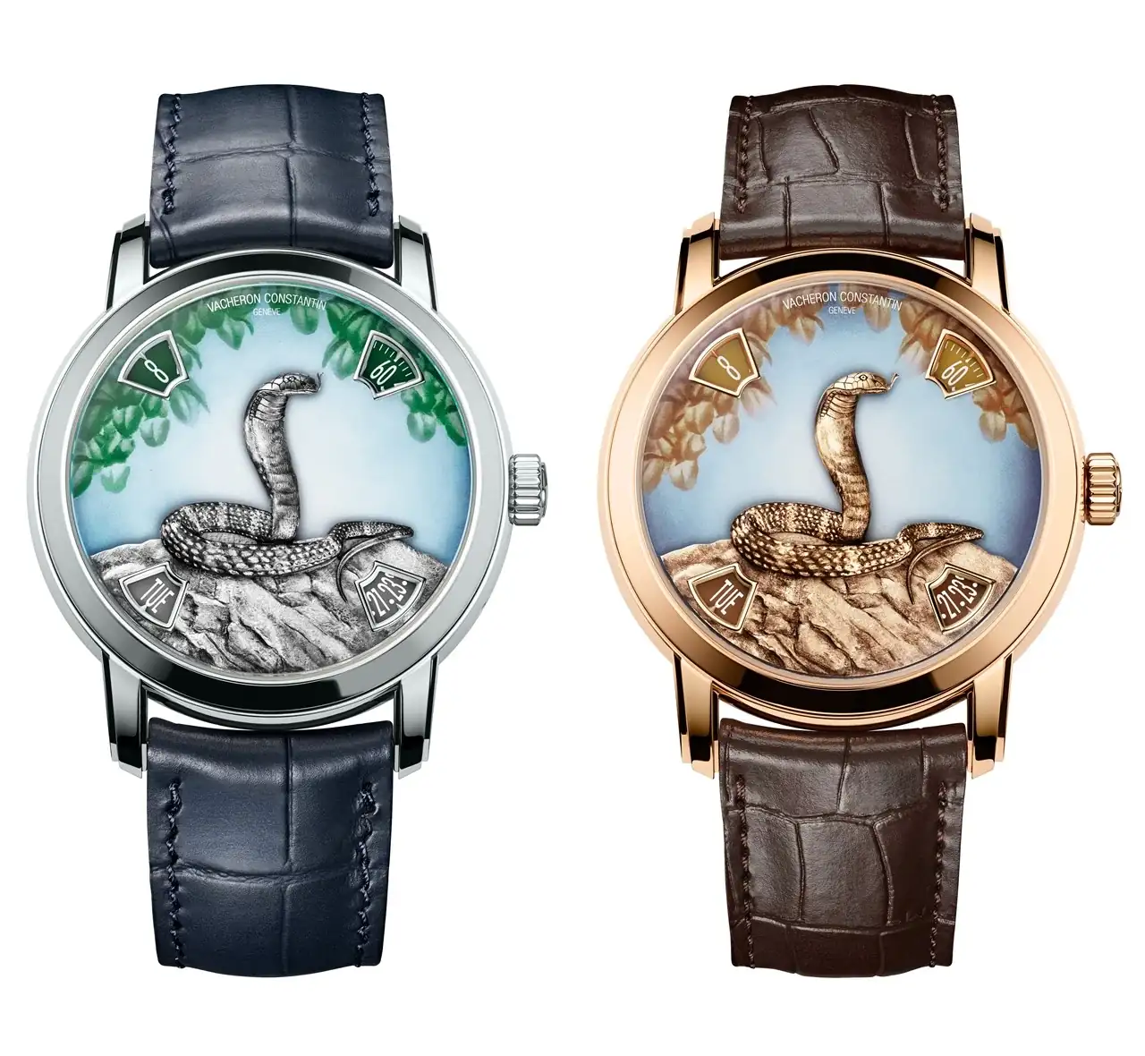 Tras un primer ciclo de 12 años durante el cual Vacheron Constantin dedicó dos series limitadas a cada signo del zodíaco chino, la Maison lanza este año una nueva serie Métiers d'Art, La Leyenda del Zodíaco Chino, uniendo el grabado y el esmaltado en miniatura para crear dos nuevas series limitadas de 25 piezas en oro rosa o platino. El calibre 2460 G4, con indicaciones por disco permite dar rienda suelta a la expresión artística de los artesanos. La serpiente, símbolo de sabiduría y animal misterioso asociado a la renovación y la agilidad, el sexto signo del zodiaco chino también trae buena suerte y prosperidad.