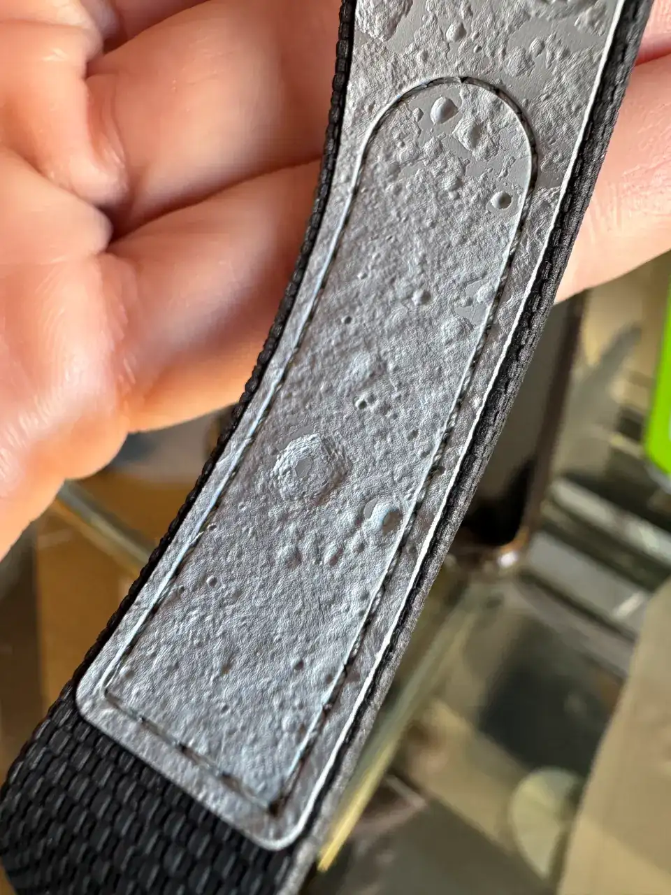 Las que vi en los Moonswatch expuestos con precios muy superiores a los 275€ habituales con el los hemos venido viendo habitualmente (velcro) y que pensaba eran de piel estilo nobuck me dicen que son de Avestruz y no se venden sueltas, solo con los relojes en precio de venta de 385€