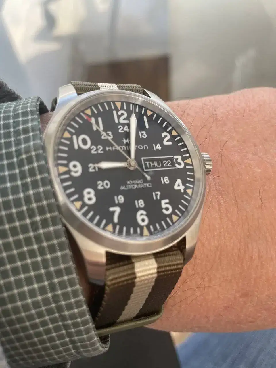 Hamilton Khaki Day Date 42. Está pieza la llevaba dos años mirando porque me encantaba tener diferente color del Khaki Titanium 42 Negro PVD que tengo hace años. Es un reloj bonito y muy cómodo.