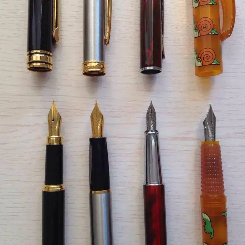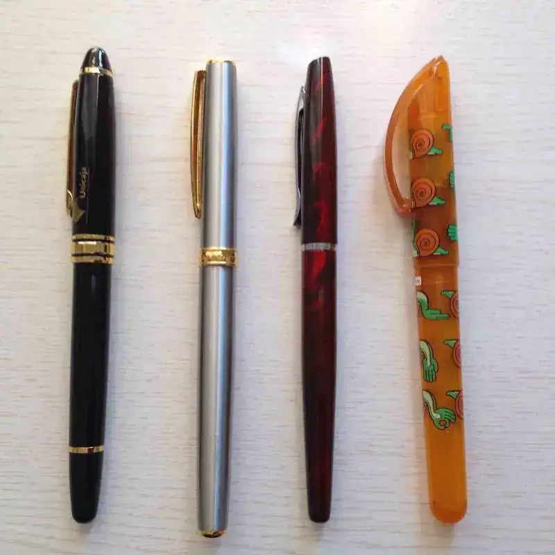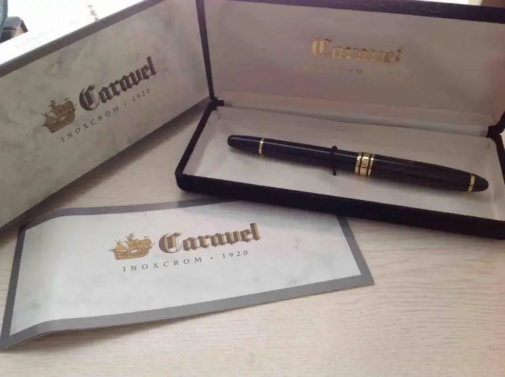 Son dos inoxcrom, y una que supongo china por su inscripción en el plumin, y desconozco modelo. La cuarta, primera por la izquierda en las fotos, es una Caravel 2 de inoxcrom, Publicidad de una caja de ahorros que una tía mía encontró por su casa y me trajo. Él plumin no reza con sello de la casa española, pero viene en su cajita de terciopelo negro y el libreto pertinente hablando de este modelo, en su embalaje original. Se la dio el banco a mi tío abuelo, pero como él usaba bolígrafo, nunca se ha llegado a usar.