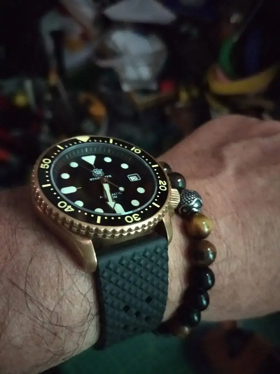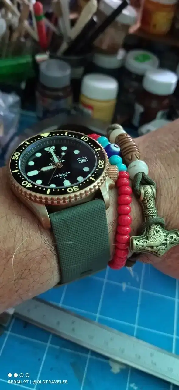 En el bronce tambien influye en Ph de la piel del usuario, yo tengo brazaletes y anillos de bronce y no se ponen verdes como el reloj de la foto, incluso mi SKX de bronce, no ha tomado ese color.