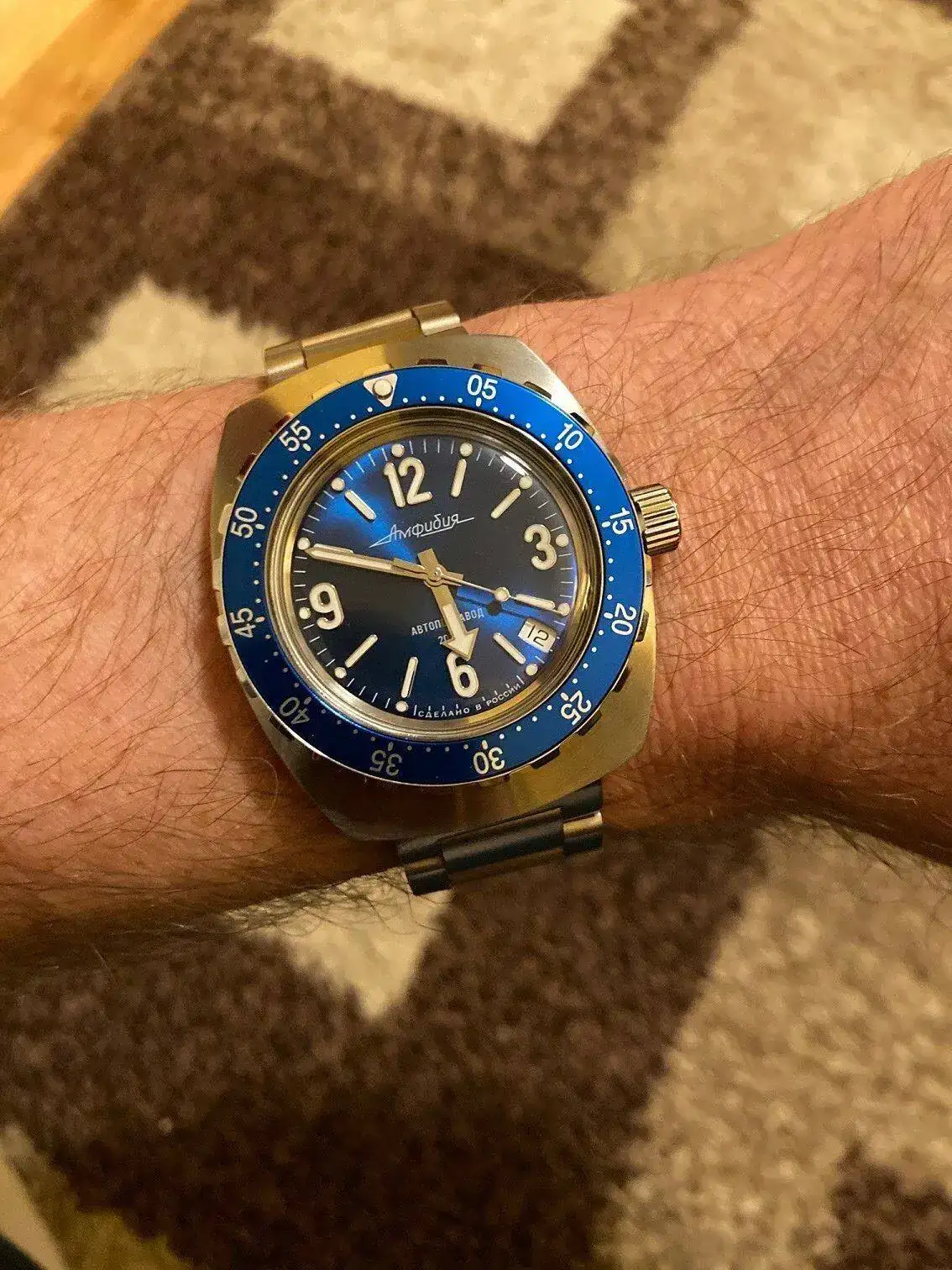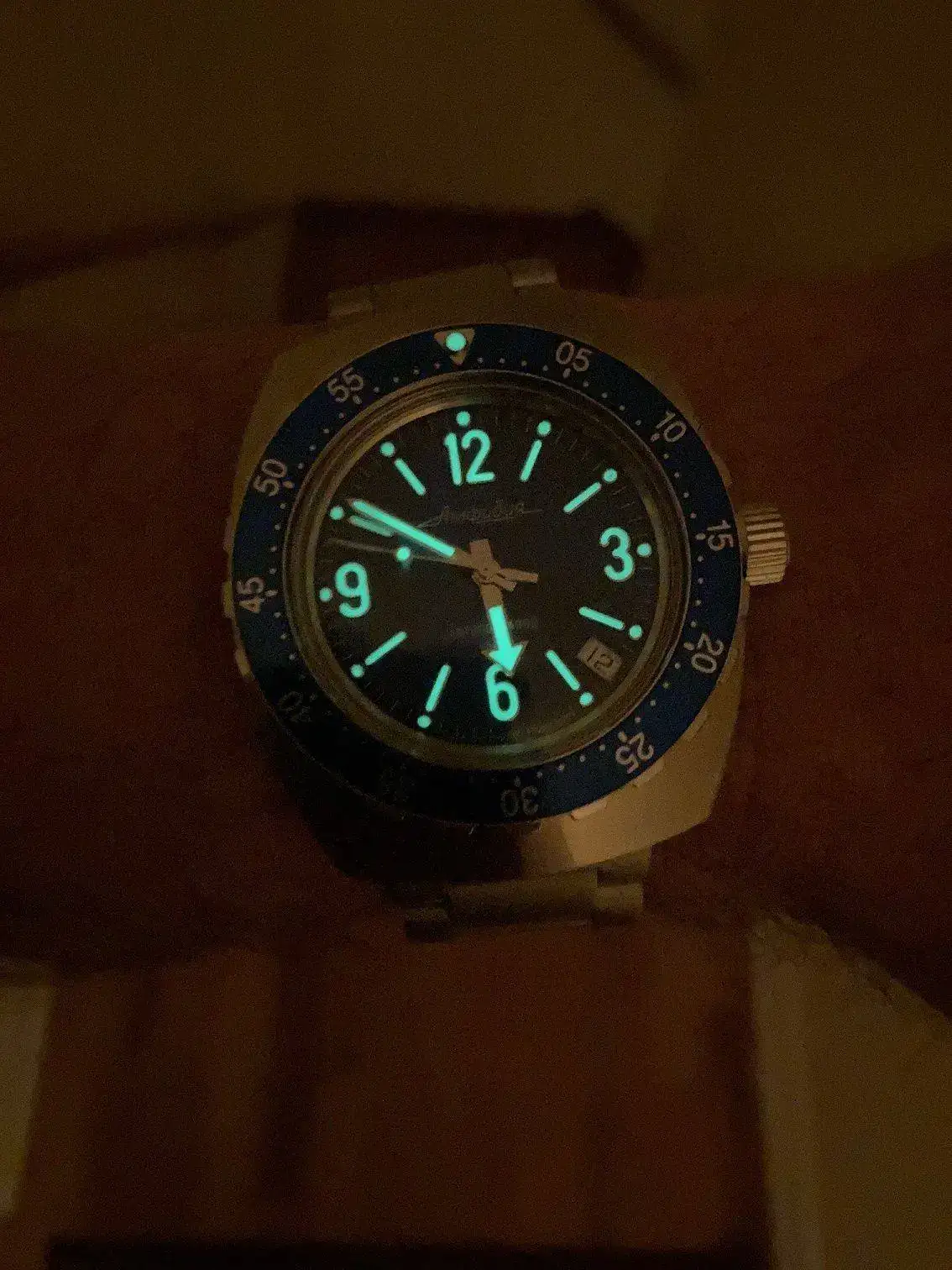 Very vibrant blue dial with sunburst. Raised / bordered hour markers and luminous dots.