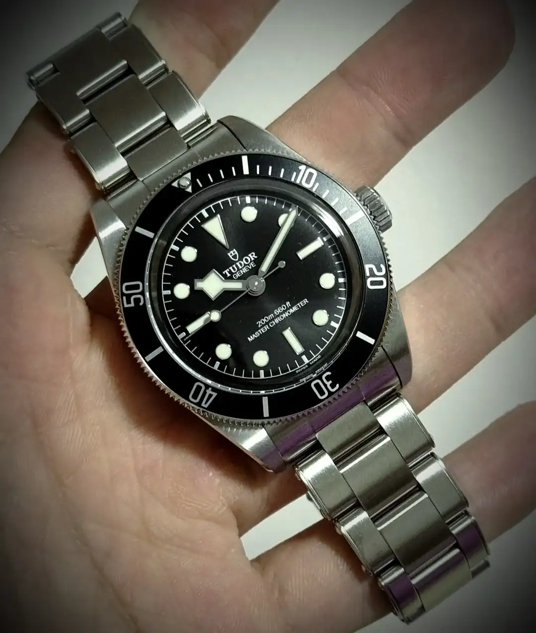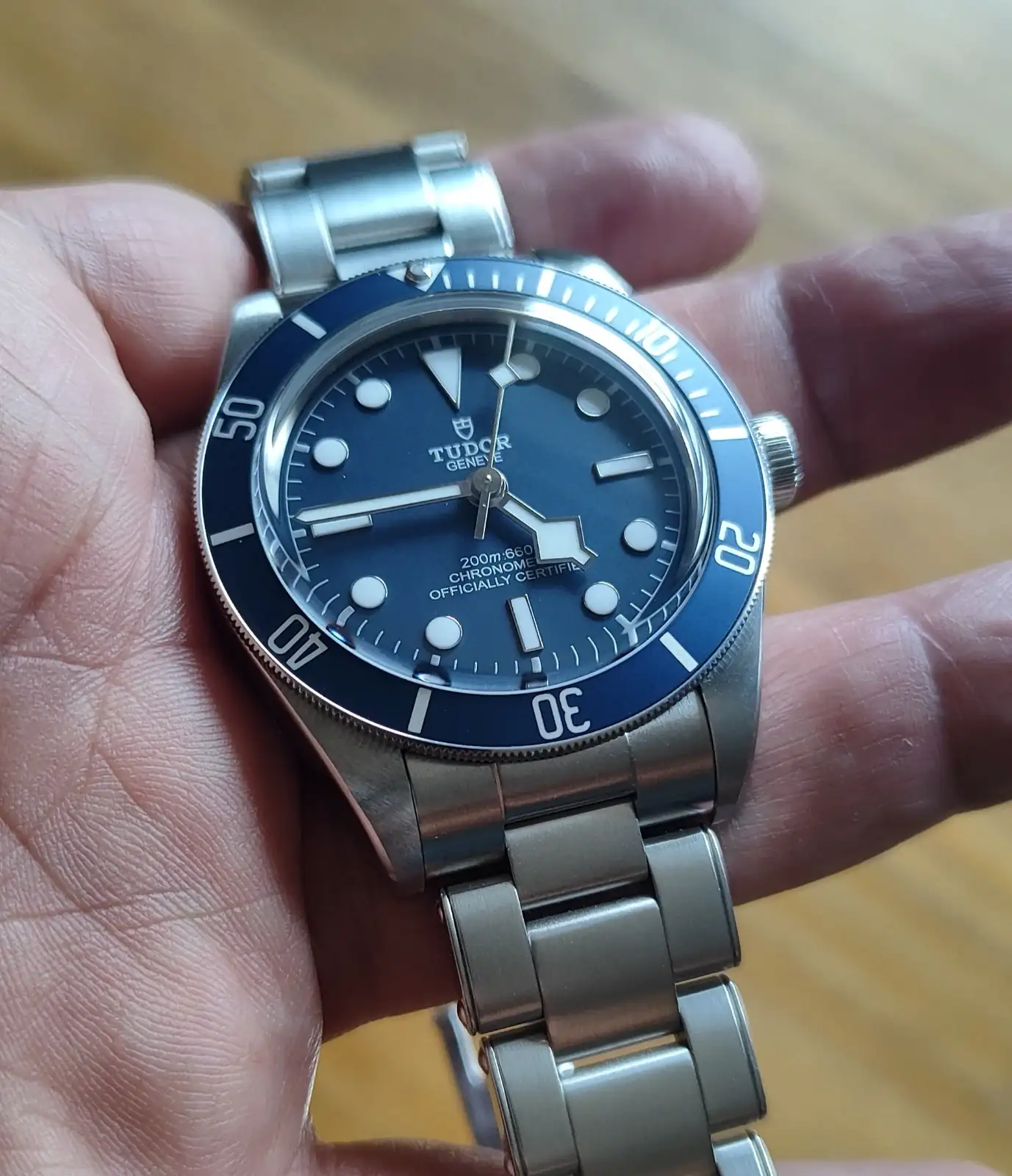 Contundente es la palabra que me viene a la cabeza... mira que los MM300 o los Planet Ocean son más altos, aunque efectivamente Tudor, no es experta en disimular grosores. Pienso que el no rebajar la altura del Pro, es porque se comería en ventas al hermano verde sinceramente. A mi me tiene encantado el Pro, aun con su contundente grueso, como es más visual que real, luego se lleva muy muy bien. Eso sí, me ha tocado el ajuste puñetero... ese que el t fit abierto y un eslabón menos, aprieta un poco, y cerrado con un eslabón más, queda ligeramente suelto... a ver si mañana me llega el medio enlace, para dejar el T fit justo en el centro de los 5 puntos, y además por medidas, queda a medio camino entre "saltos" del T fit. He visto el cierre del Pro, respecto al del P39, en el punto más abierto, el muelle mantiene el eslabón separado de la mariposa en el Pro, y la separación entre centros de tornillo de eslabones, es mayor en el pro que en el p39, por lo que solo en el pro, notas que el salto este que comento, es mayor en realidad que lo que las medidas sugieren, algo que no pasa en el P39. Es decir, que en el Pelagos, si te toca que pones un eslabón y cierras el cajetín, el salto es el mismo que entre puntos del tfit... respecto de abierto y un eslabón menos. En el BB Pro no pasa eso.