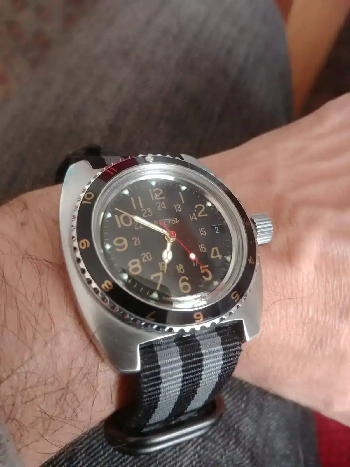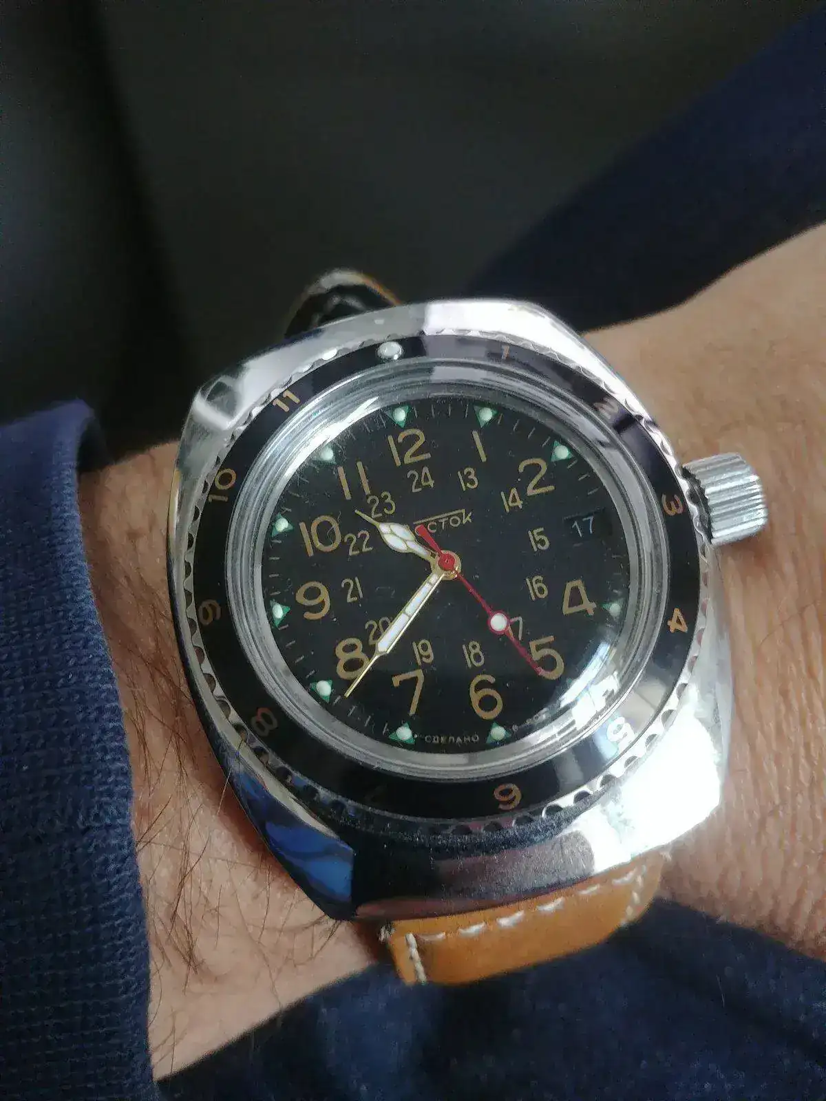 ¿Soy ya un 'modder'? De esto, ¿cómo se sale? Bueno, ya en serio. Me encanta mi Vostok -sospecho que el primero de unos cuantos-, pero no me gustaba que el pulido, sobre todo del bisel, que es lo que más se ve, brillara tanto, así que tras un par de semanas de espera por fin llegó un bisel desde Ucrania. También brillaba mucho, pero atreverse a frotar con el ScotchBrite sin estar puesto en el reloj es poco arriesgado. Si no quedaba a mi gusto, con no ponerlo...