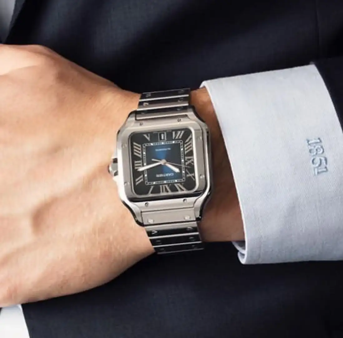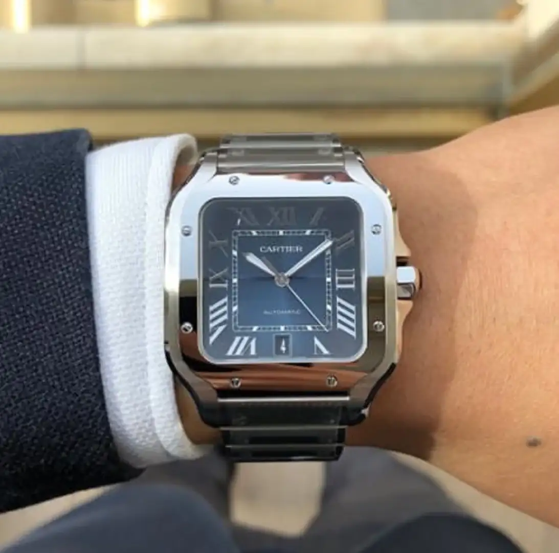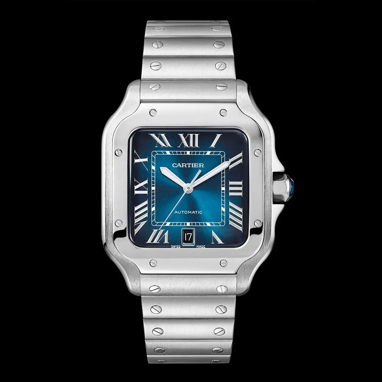 El Santos es el más lindo de los tres, aunque sea el más barato, el precio no tiene nada que ver con la belleza, y los 3 son manufactura propia. Entónces tenemos tres bellas piezas de Alta Relojería.A primeros de mes fue presentado este nuevo Cartier Santos, en su variante de dial azul.