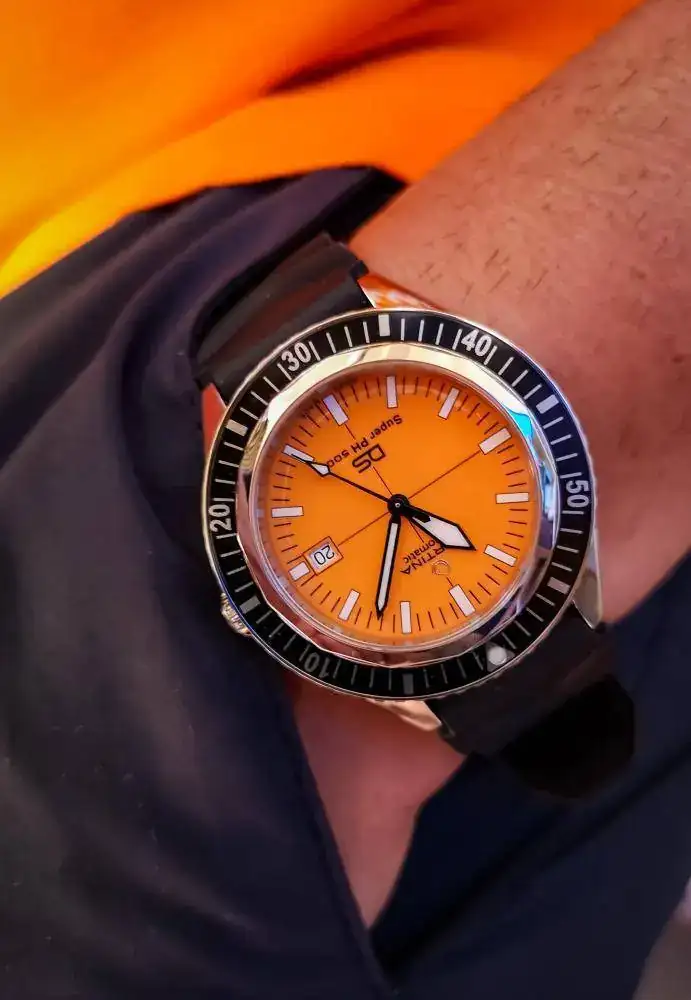 Es un reloj con un muy llamativo dial de color naranja, algo poco usual y que llama la atención. El bisel y la caja del reloj me recuerda a las colecciones de esta marca en los años 70. Y no estaba muy equivocado ya que, buscando información sobre este modelo, resulta que ha sido desarrollado en asociación con VDST (siglas de la Asociación Alemana de Buceo) y se inspira en la esencia del Certina DS-2 Super PH500 vintage original de 1968.